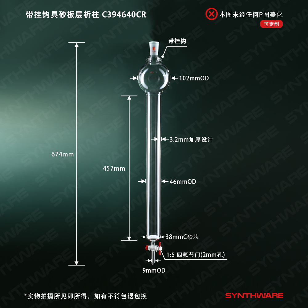 层析类 > 具存储球层析柱 > 带挂钩-具砂板存储球闪式层析柱 > SYNTHWARE > 带挂钩具砂板层析柱,24/40,φ46mm,有效长457mm,存储球容量500ml C394640CR