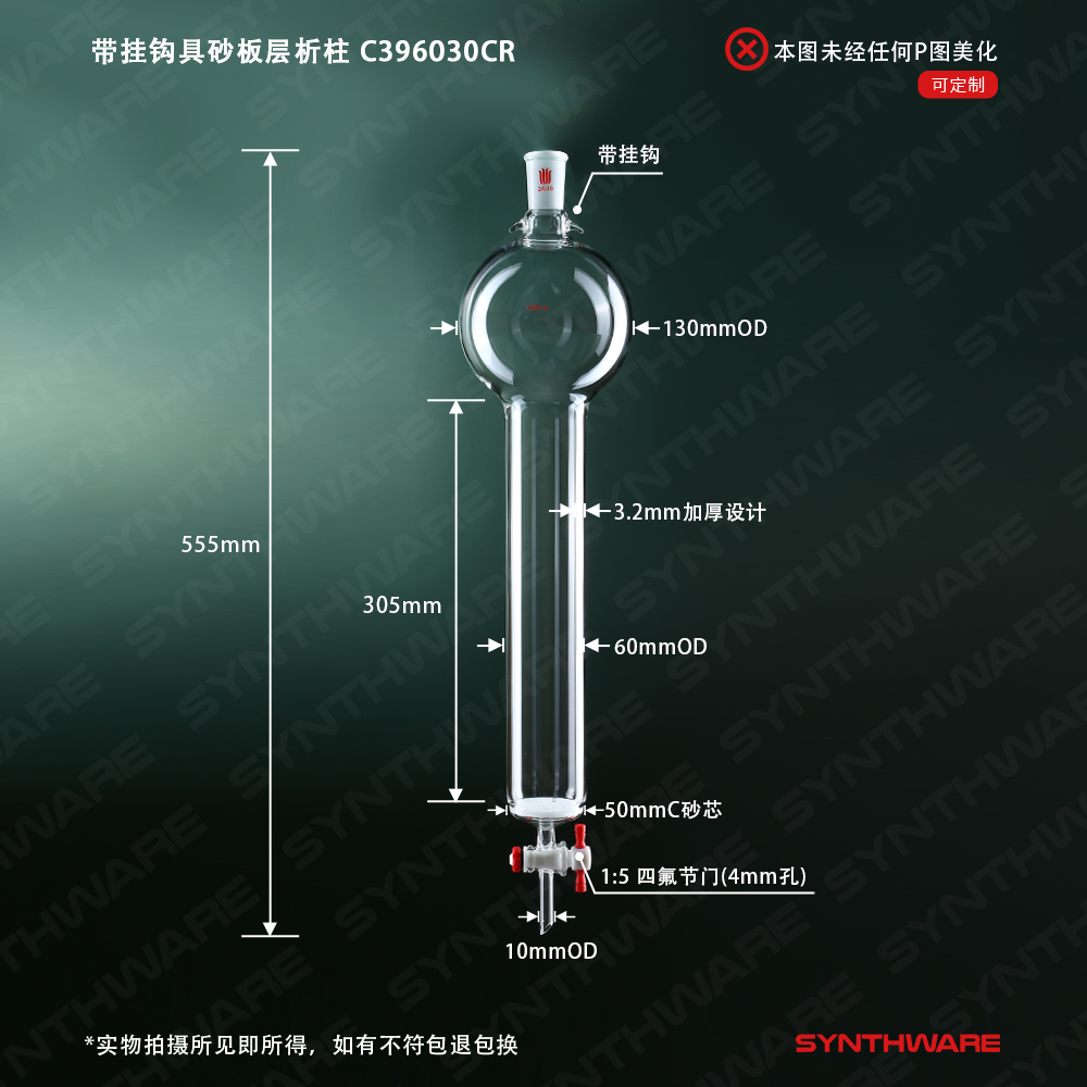 层析类 > 具存储球层析柱 > 带挂钩-具砂板存储球闪式层析柱 > SYNTHWARE > 带挂钩具砂板层析柱,24/40,φ60mm,有效长305mm,存储球容量1000ml C396030CR