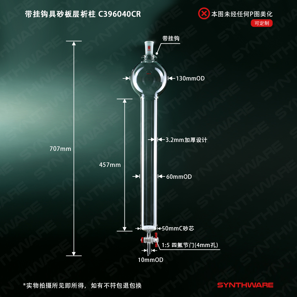 层析类 > 具存储球层析柱 > 带挂钩-具砂板存储球闪式层析柱 > SYNTHWARE > 带挂钩具砂板层析柱,24/40,φ60mm,有效长457mm,存储球容量1000ml C396040CR