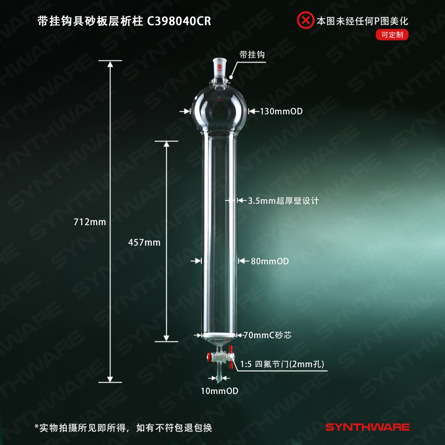 层析类 > 具存储球层析柱 > 带挂钩-具砂板存储球闪式层析柱 > SYNTHWARE > 带挂钩具砂板层析柱,24/40,φ80mm,有效长457mm,存储球容量1000ml C398040CR
