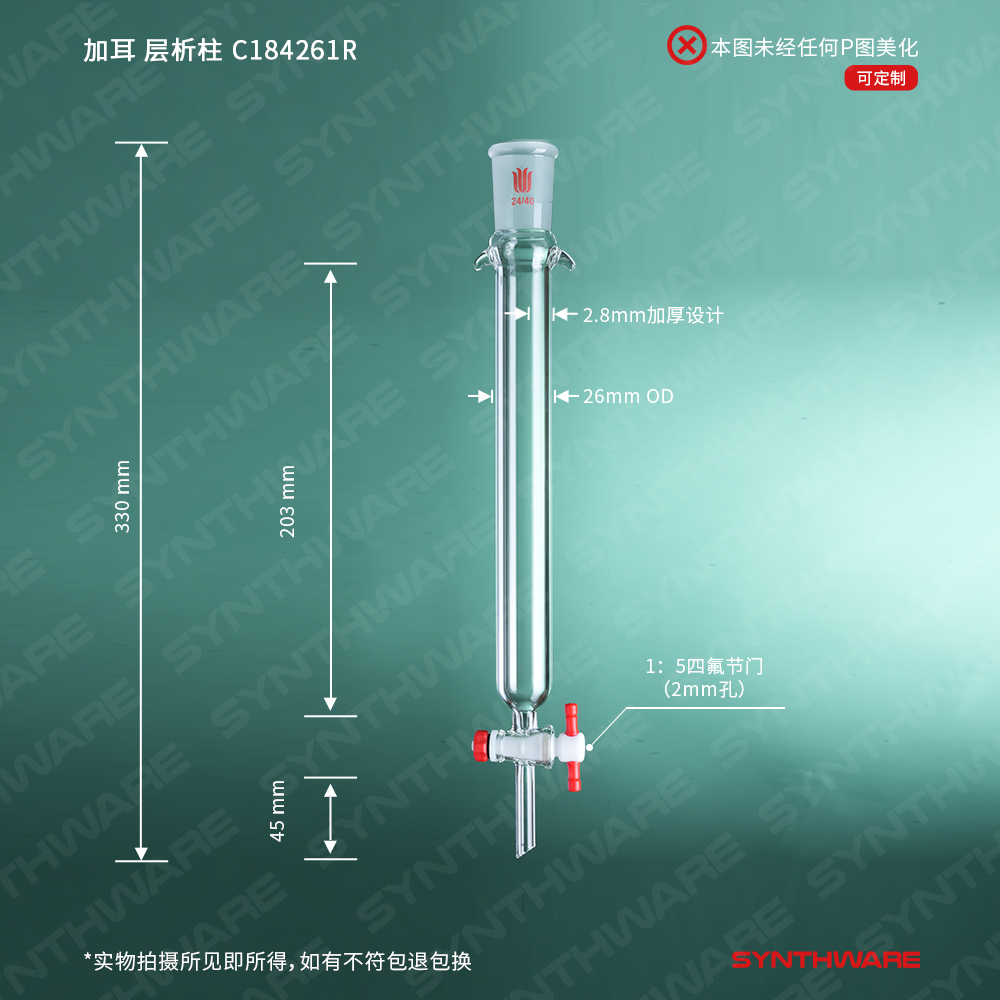 层析类 > 层析柱 > 带挂钩-闪式-无砂板层析柱 > SYNTHWARE > 加耳 层析柱,φ26mm,有效长203mm,节门孔径:2mm,24/40 C184261R