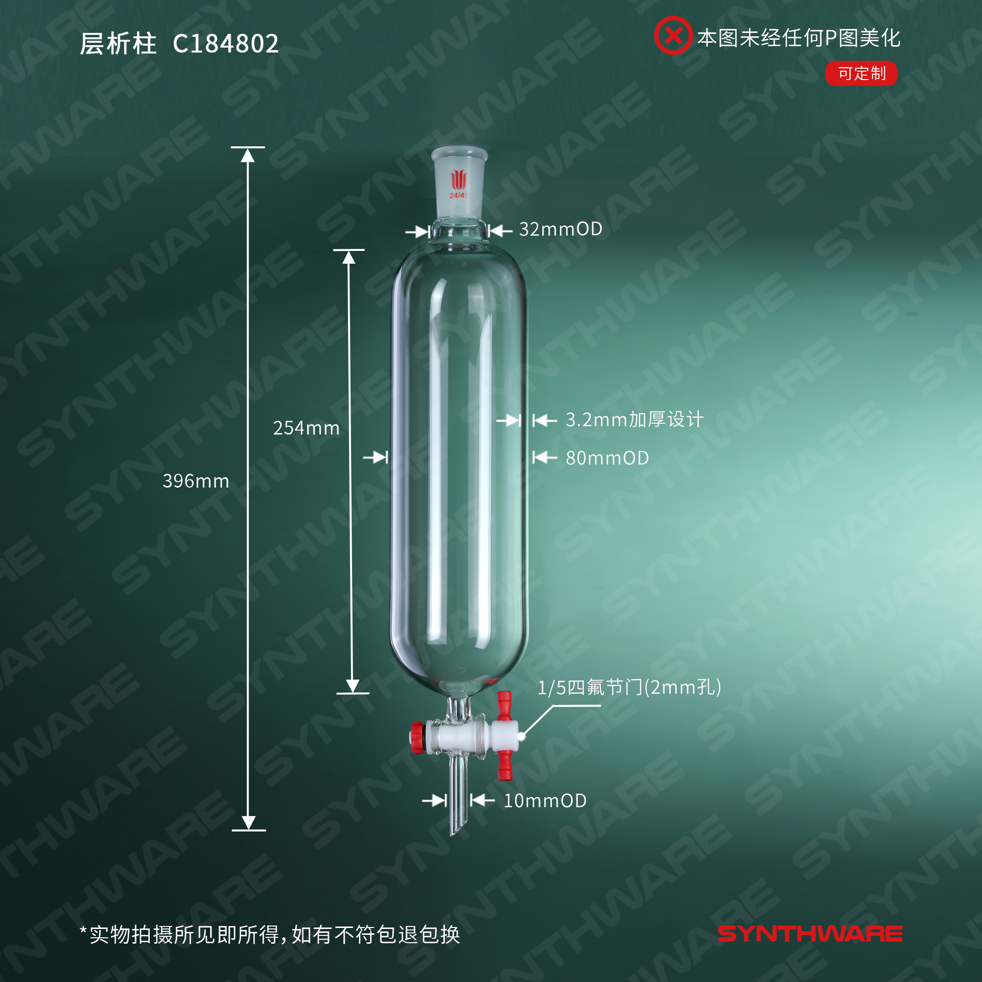 层析类 > 层析柱 > 无砂板闪式层析柱 > SYNTHWARE > 层析柱,φ80mm,有效长254mm,节门孔径:4mm,24/40 C184802