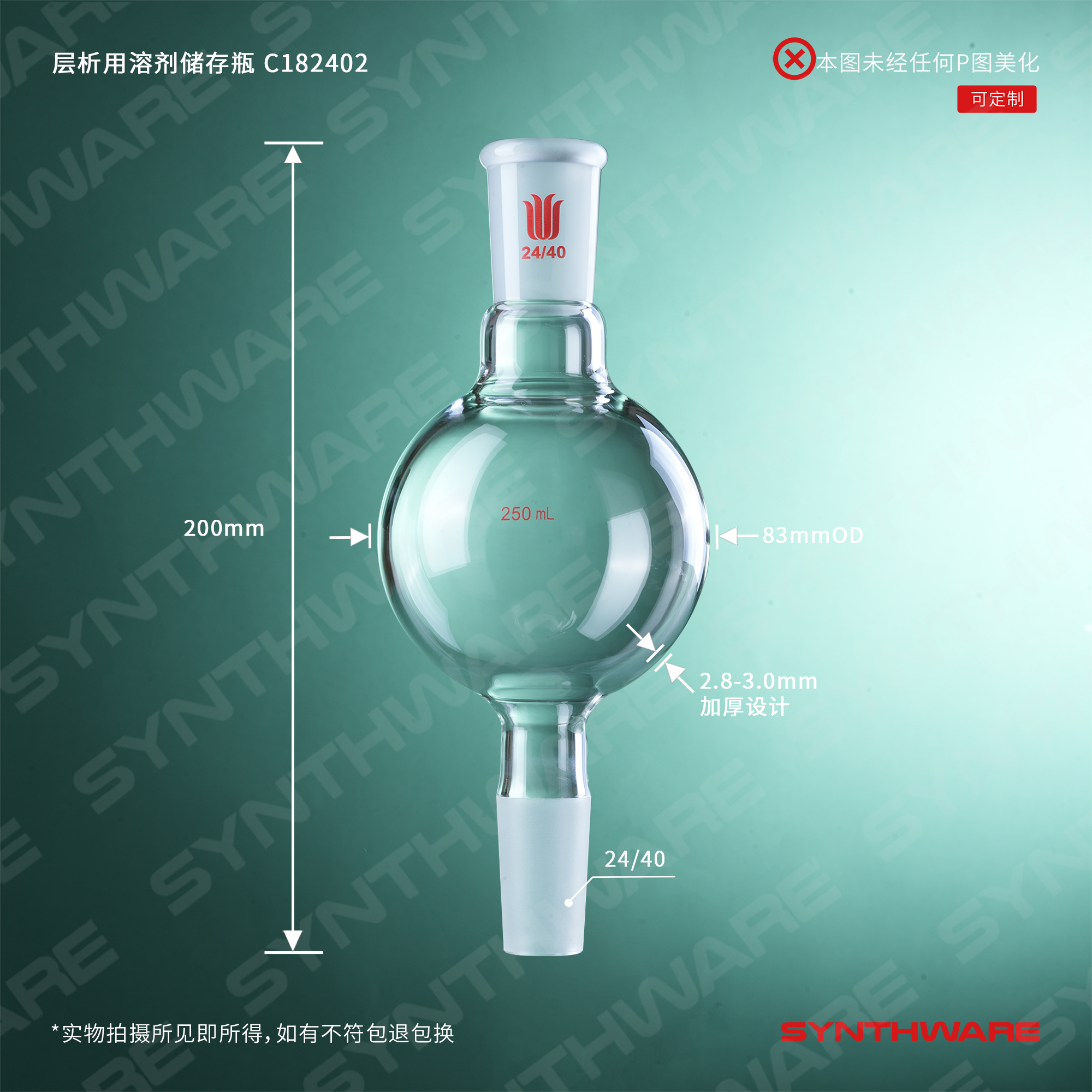 层析类 > 层析用溶剂存储瓶 > 球瓶上下为内外磨口溶剂存储瓶 > SYNTHWARE > 层析用溶剂存储瓶,24/40,250ml C182402