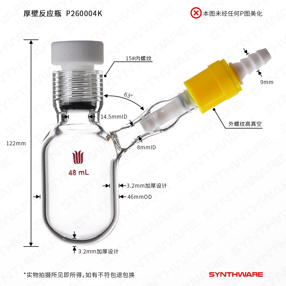 反应瓶 > 厚壁反应瓶 > 自带通气孔高真空阀厚壁反应瓶 > SYNTHWARE > 15#内螺纹48ml厚壁反应瓶,具侧管带通气孔高真空阀 P260004K