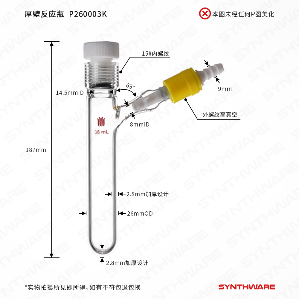 反应瓶 > 厚壁反应瓶 > 自带通气孔高真空阀厚壁反应瓶 > SYNTHWARE > 15#内螺纹38ml厚壁反应瓶,具侧管带通气孔高真空阀 P260003K