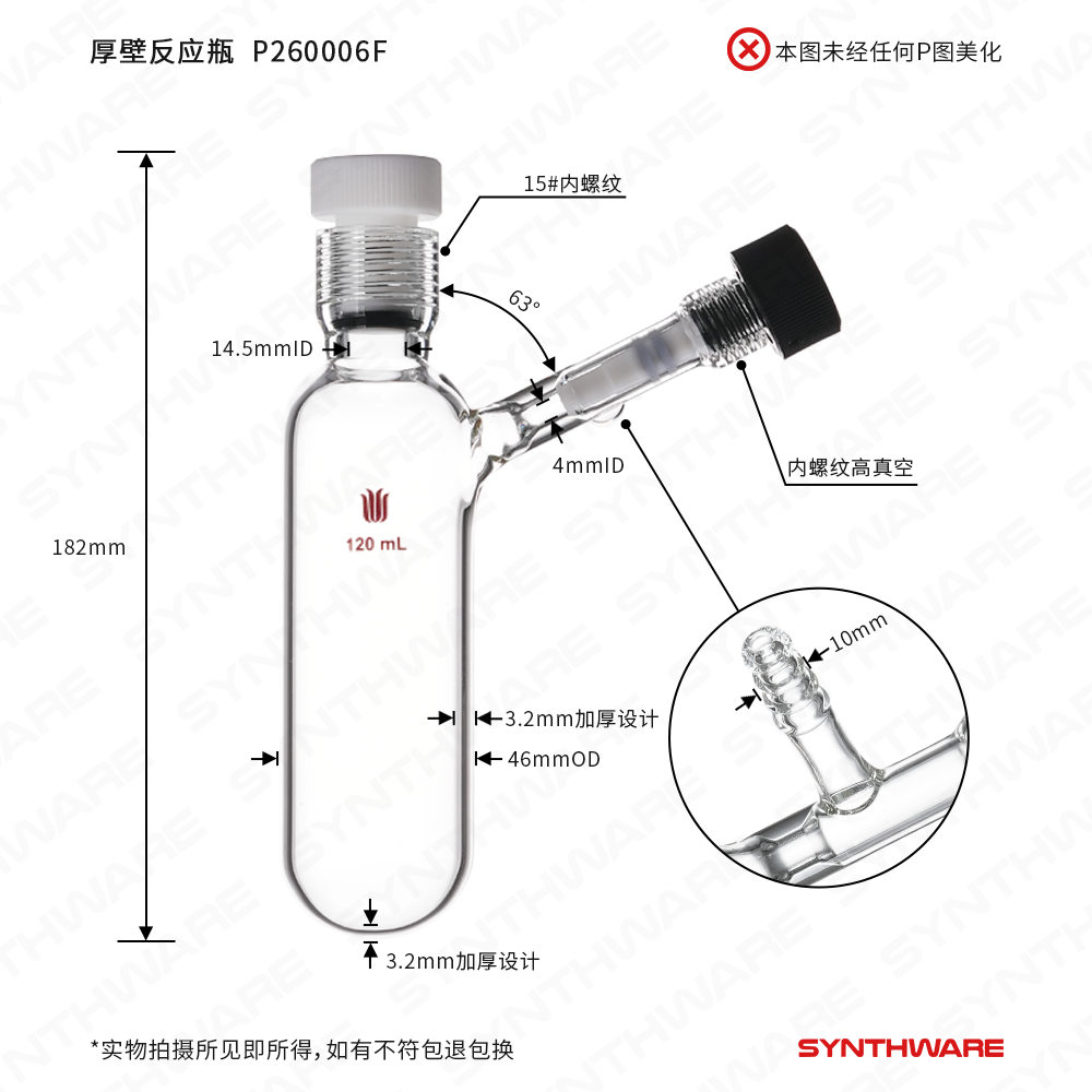 四氟全包O型圈,15#内螺纹100ml厚壁反应瓶,侧管7#内螺纹4mm高真空 P260005F