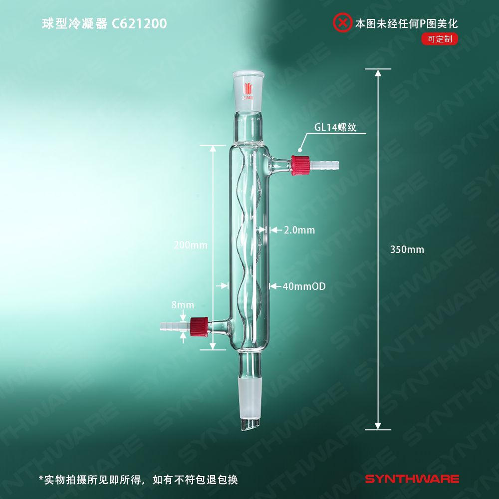 # 球型回流冷凝器,外循环冷却液从冷凝器底部进,从顶部出。球型内管由特殊工装制得,确保球间距一致,冷却均匀。