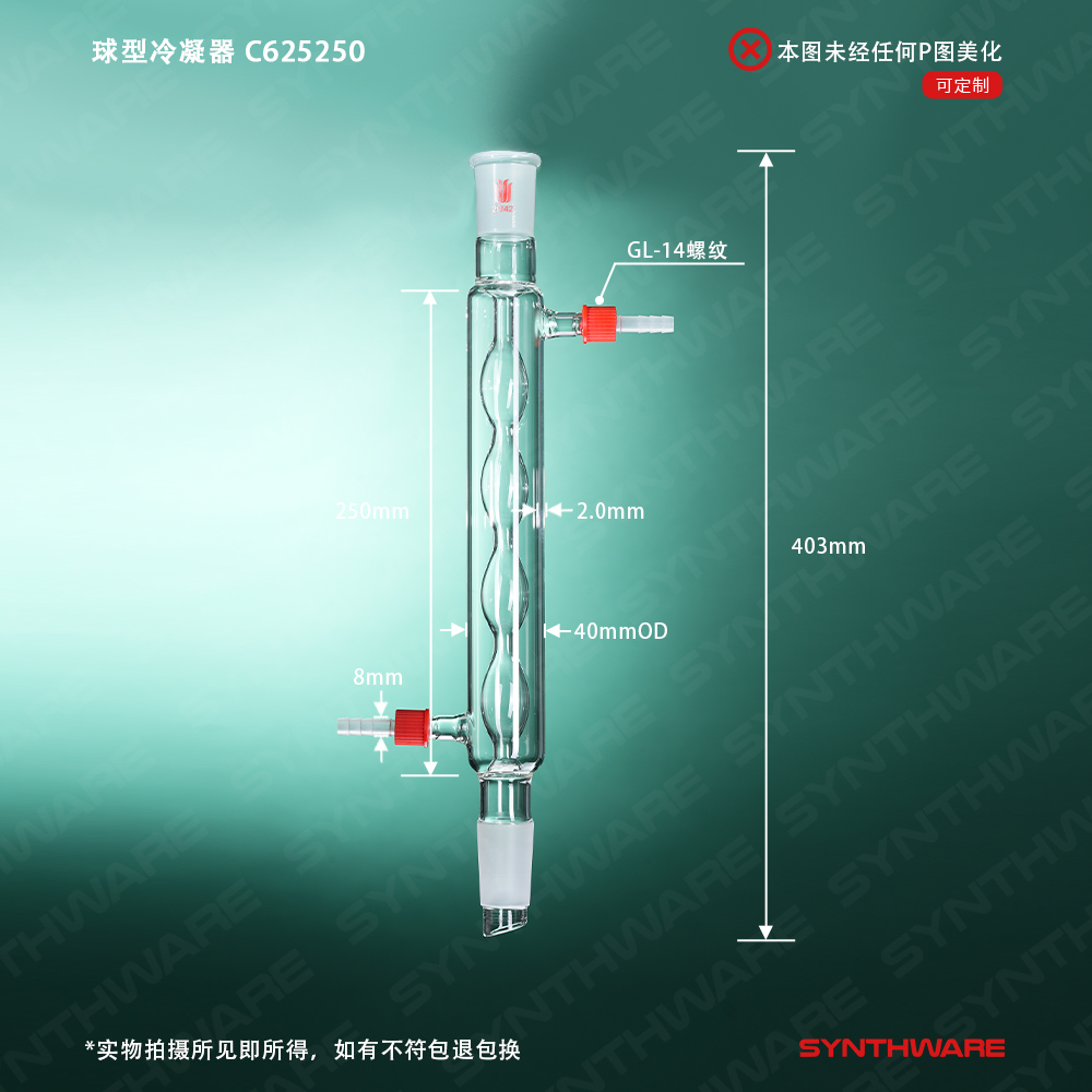 冷凝器 > 球形冷凝器 > 球形冷凝器-具可拆式小咀 > SYNTHWARE > 球型冷凝器,具可拆式小咀,29/42,夹层长250mm,φ8mm小咀 C625250