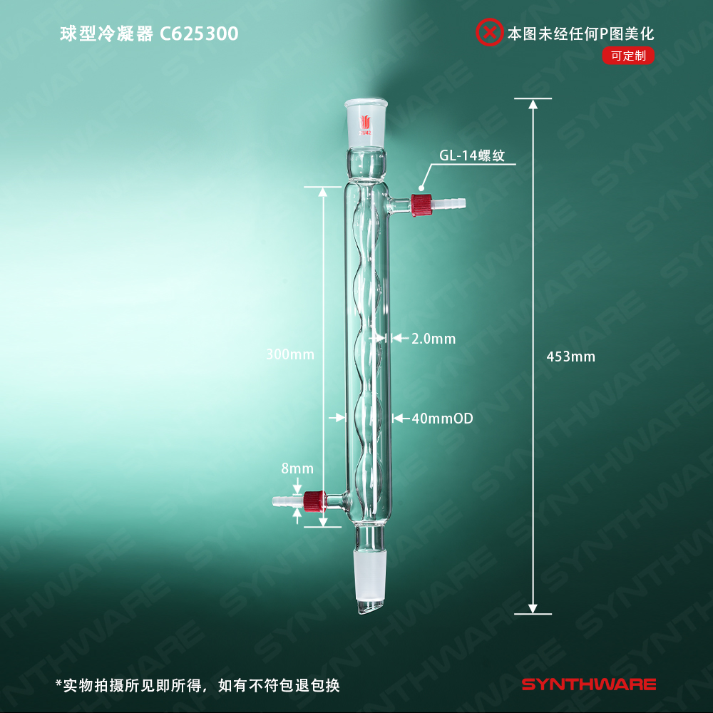 冷凝器 > 球形冷凝器 > 球形冷凝器-具可拆式小咀 > SYNTHWARE > 球型冷凝器,具可拆式小咀,29/42,夹层长300mm,φ8mm小咀 C625300
