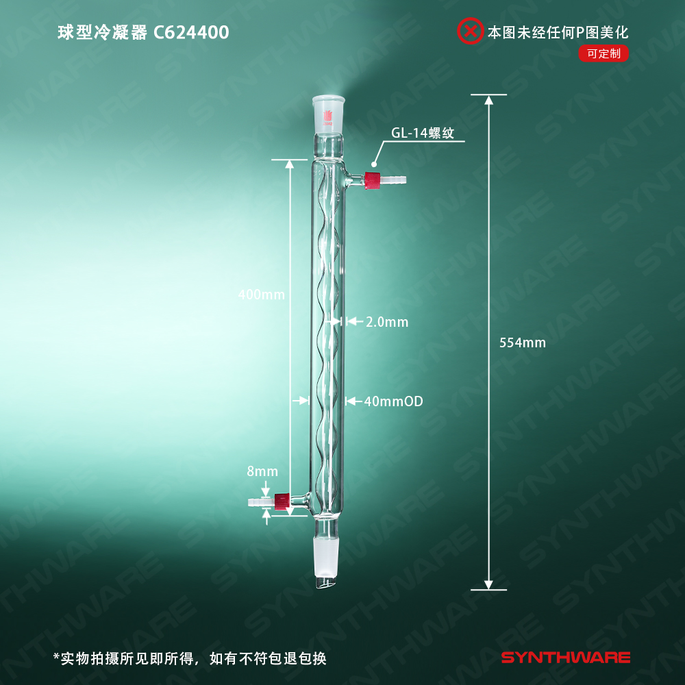 # 球型回流冷凝器,外循环冷却液从冷凝器底部进,从顶部出。球型内管由特殊工装制得,确保球间距一致,冷却均匀。