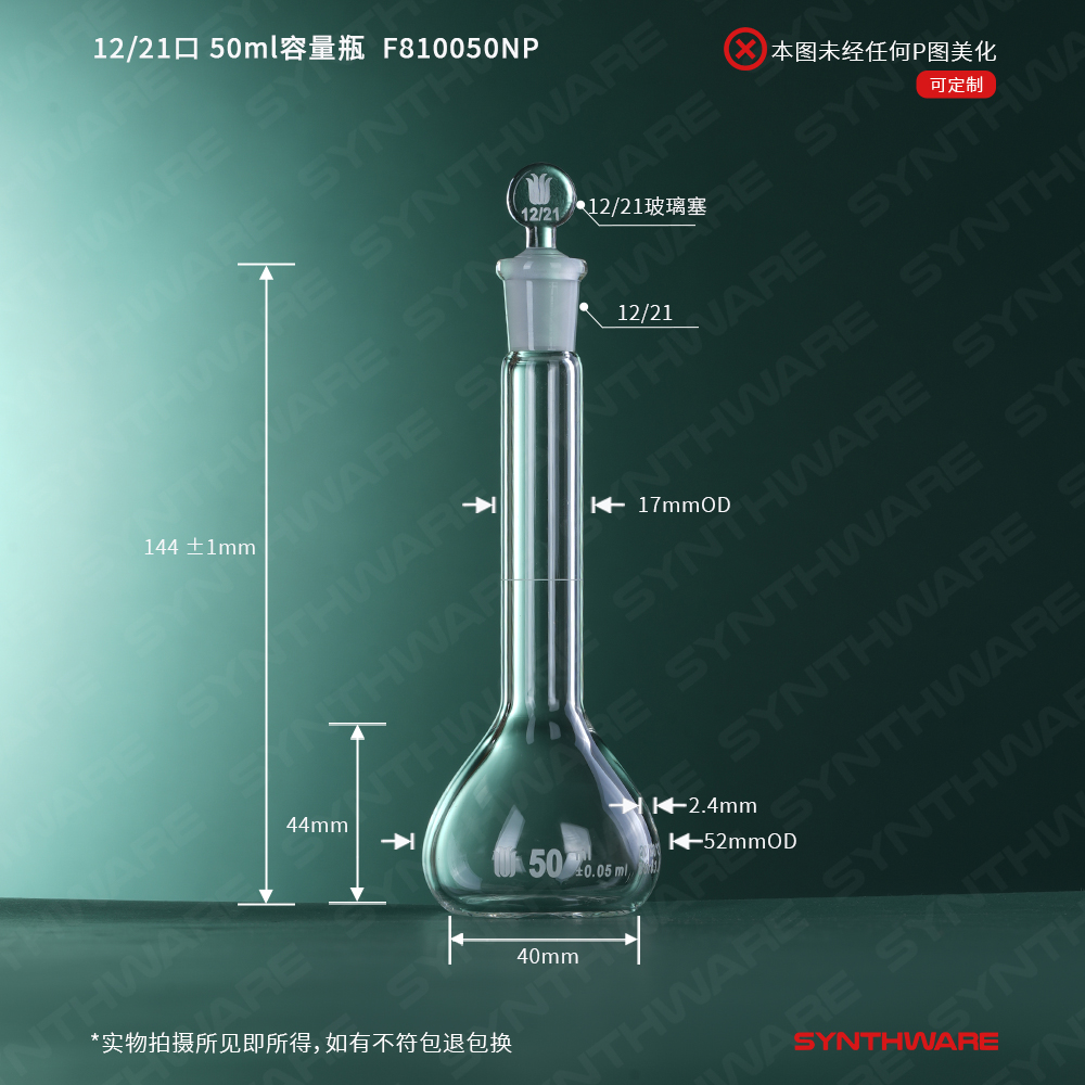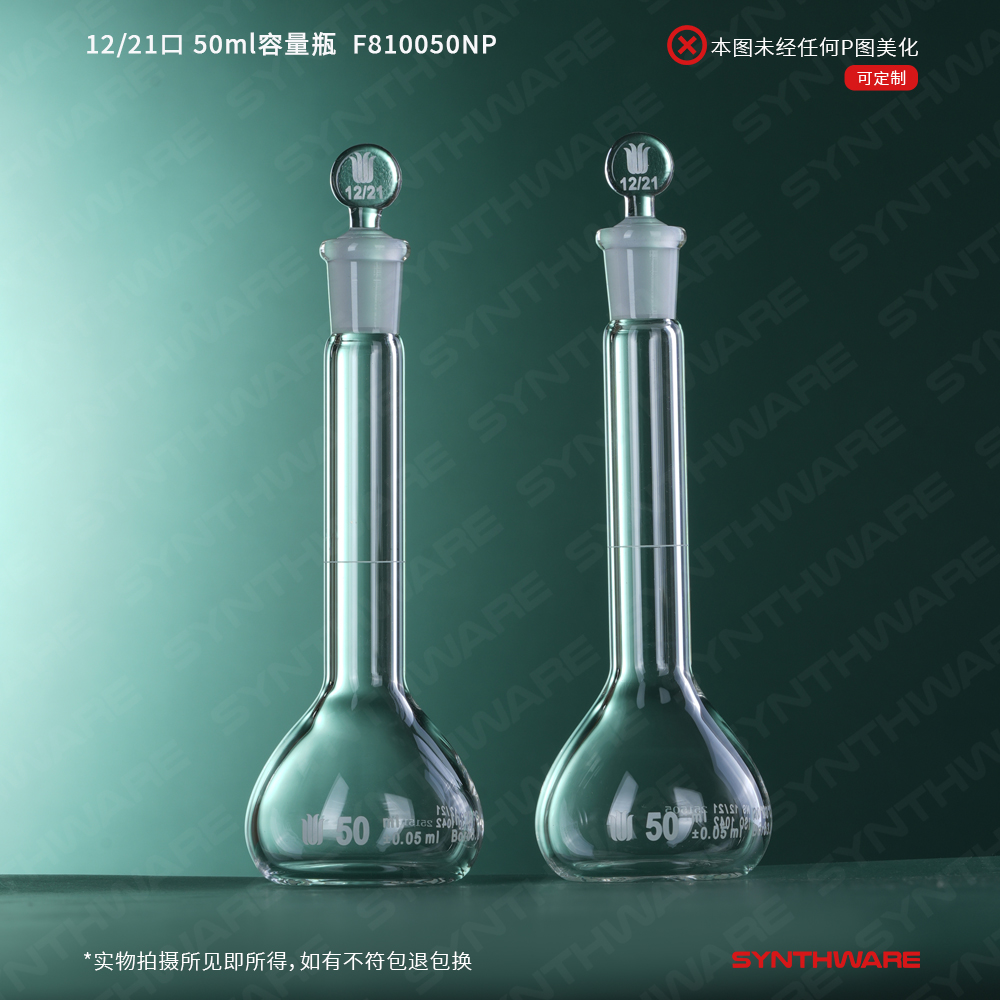 12/21口 50ml容量瓶,标配玻璃塞,不带个体检测证书,2支/盒 F810050NP