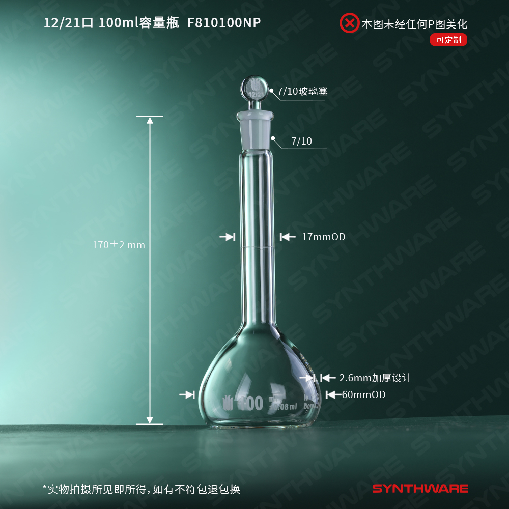 12/21口 100ml容量瓶,标配玻璃塞,不带个体检测证书,2支/盒 F810100NP