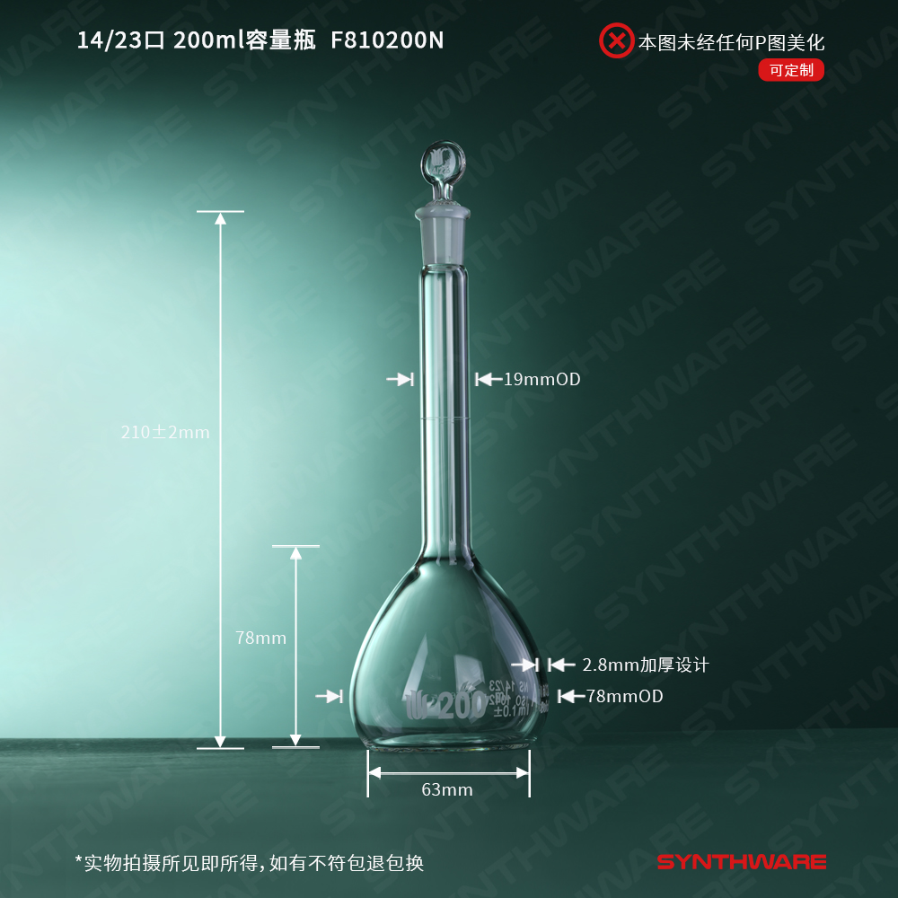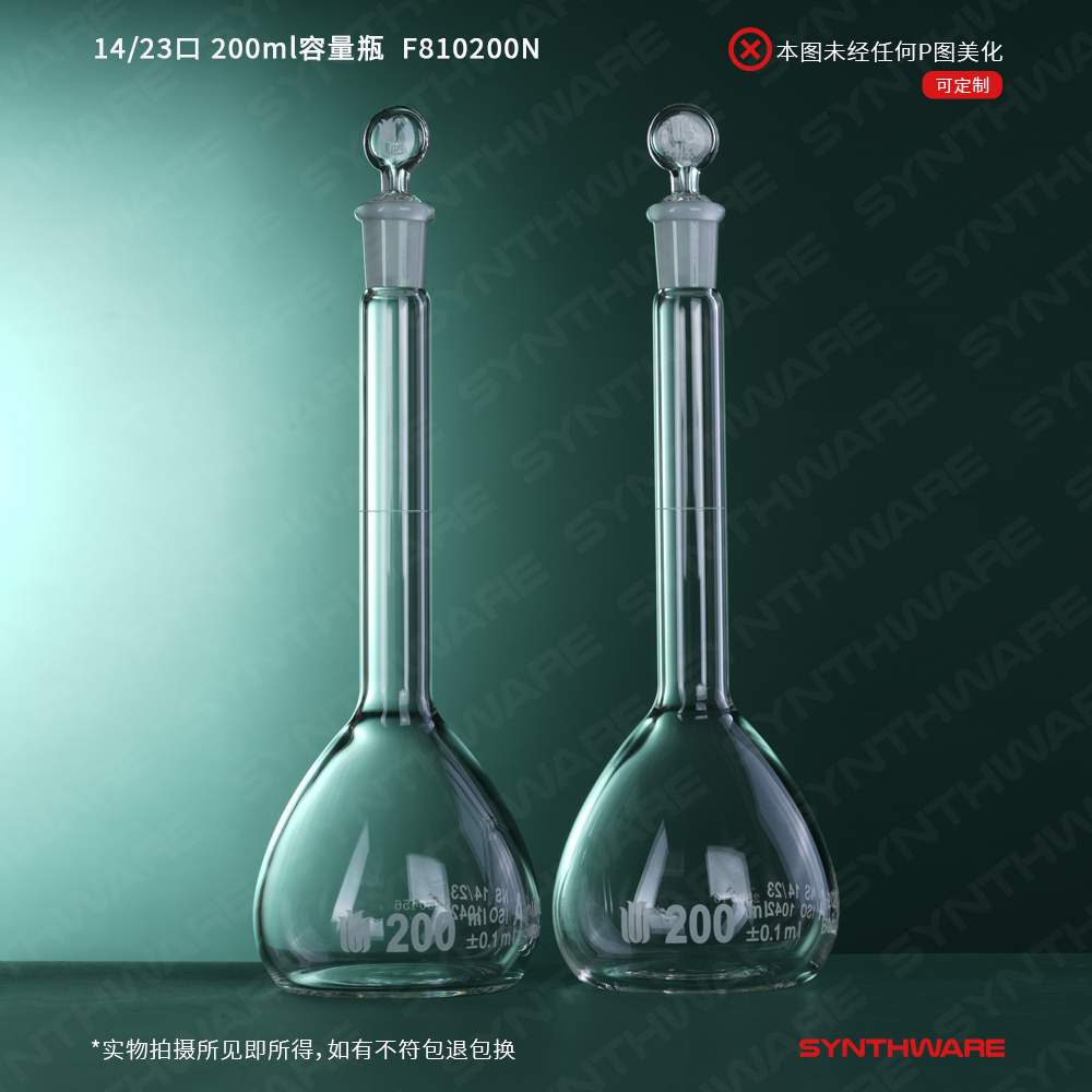 14/23口 200ml容量瓶,标配玻璃塞,带个体检测证书,2支/盒 F810200N
