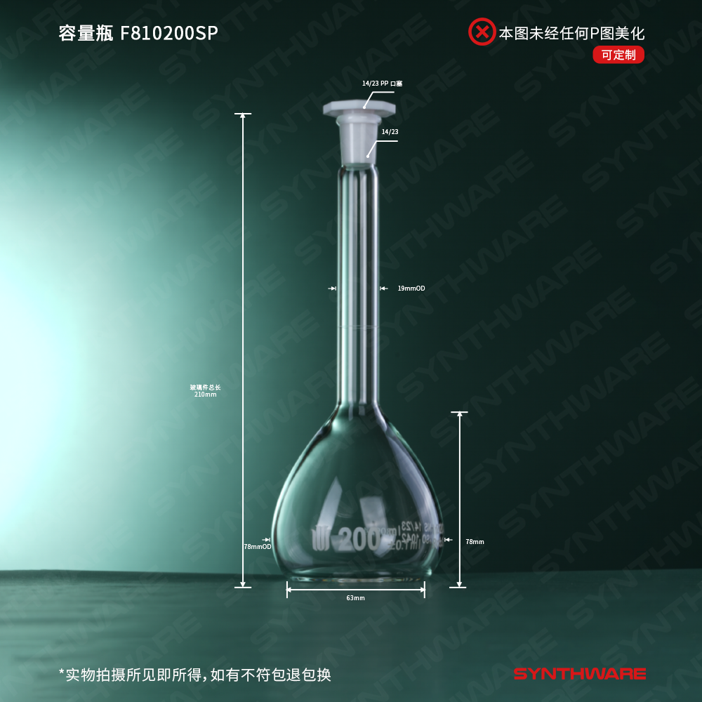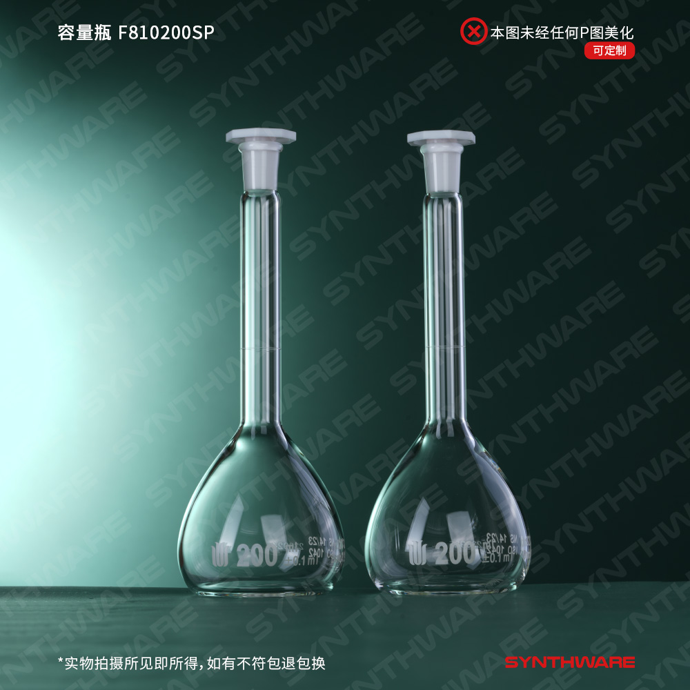 14/23口 200ml容量瓶,标配塑料塞,不带个体检测证书,2支/盒 F810200SP