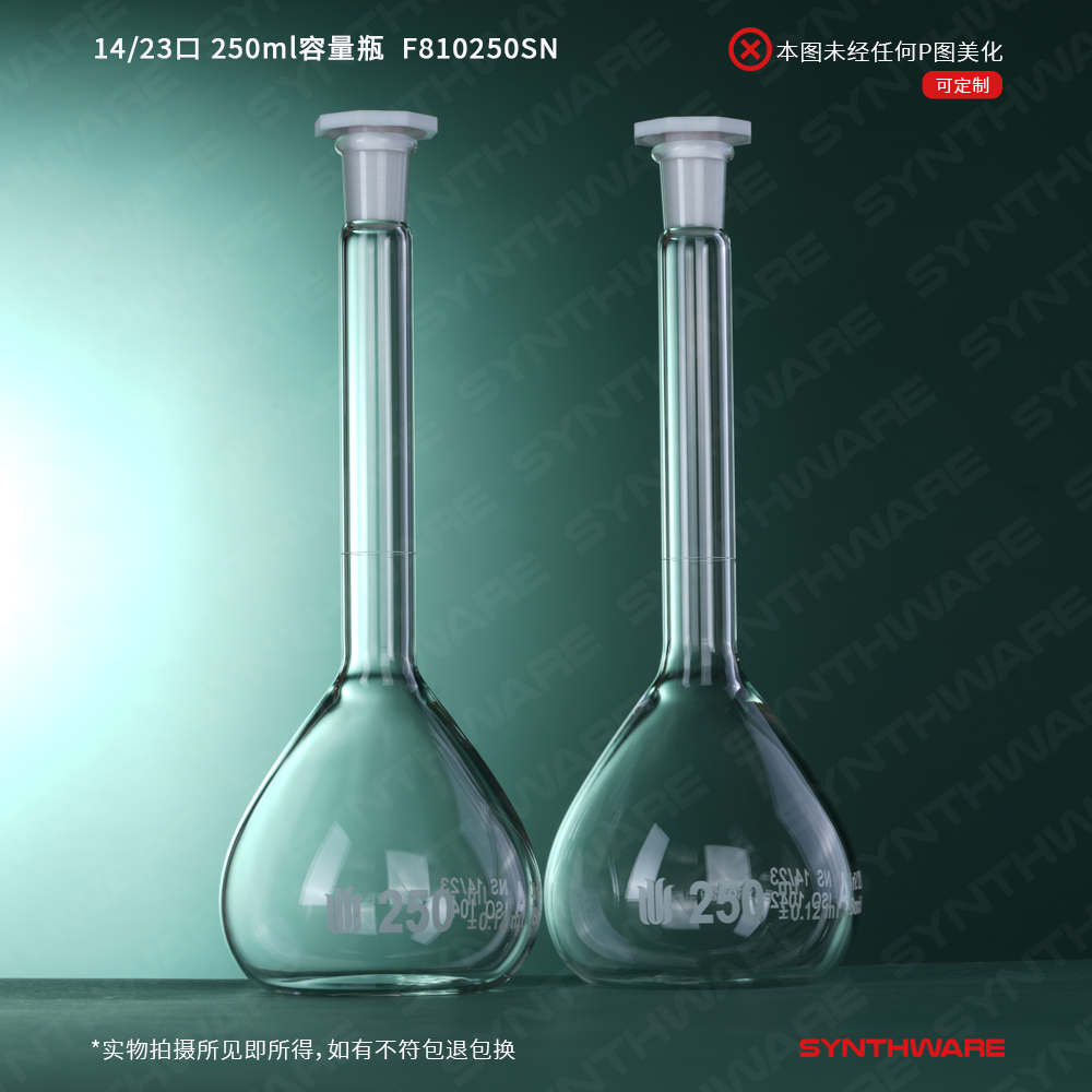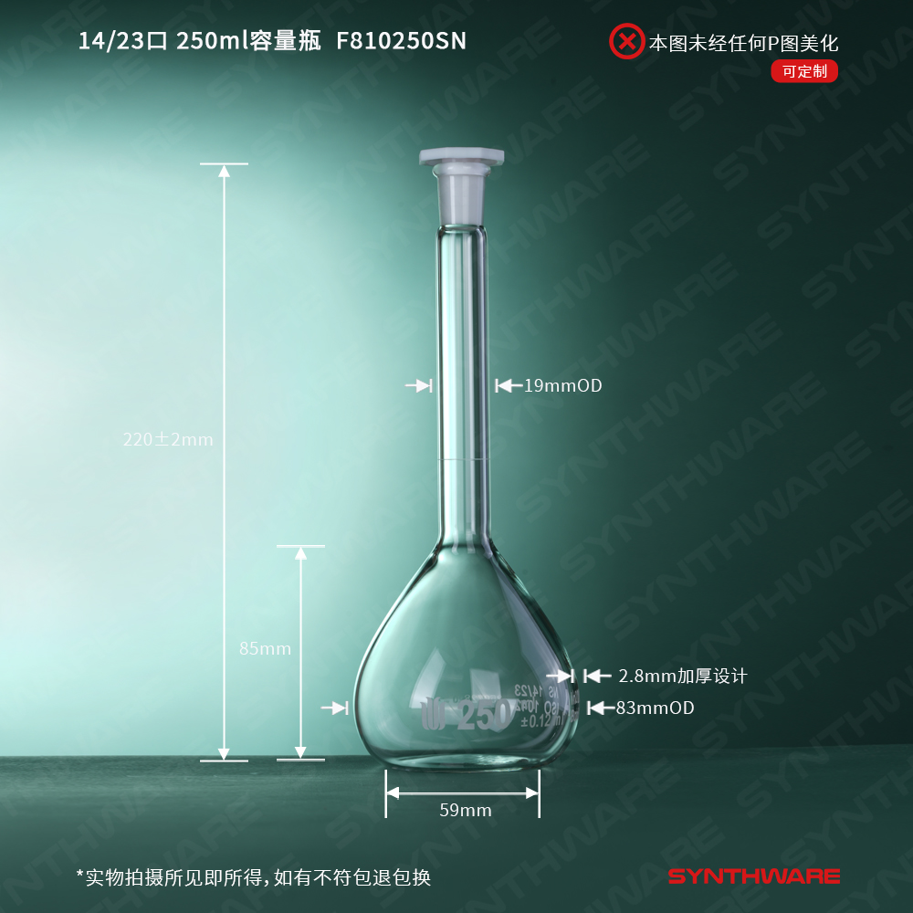 14/23口 250ml容量瓶,标配塑料塞,带个体检测证书,2支/盒 F810250SN