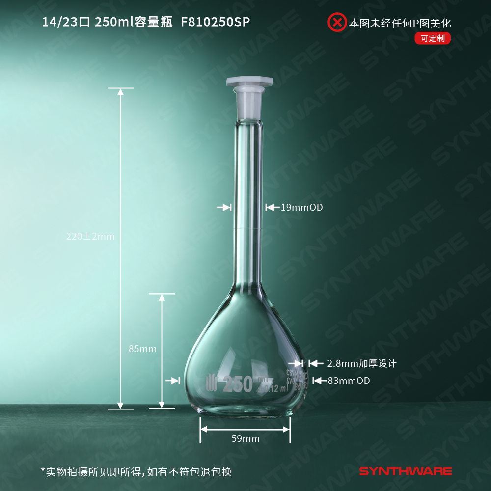 14/23口 250ml容量瓶,标配塑料塞,不带个体检测证书,2支/盒 F810250SP