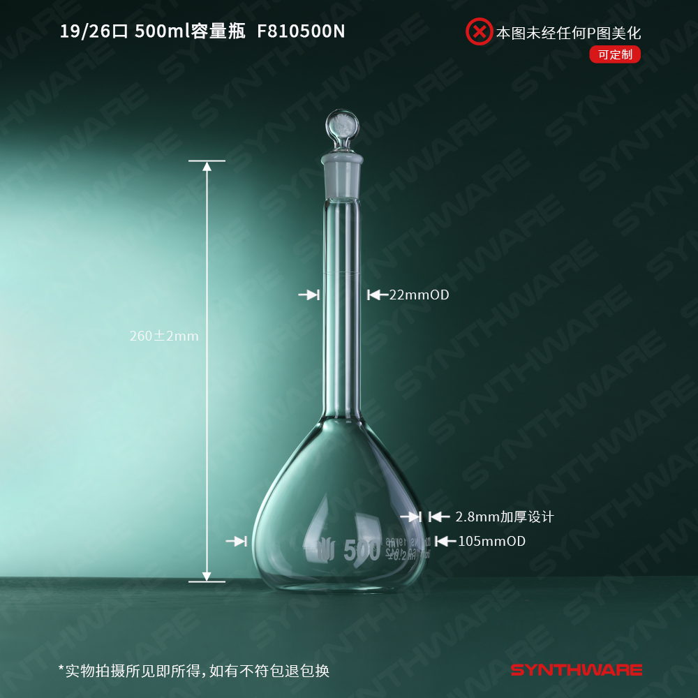 19/26口 500ml容量瓶,标配玻璃塞,带个体检测证书,2支/盒 F810500N