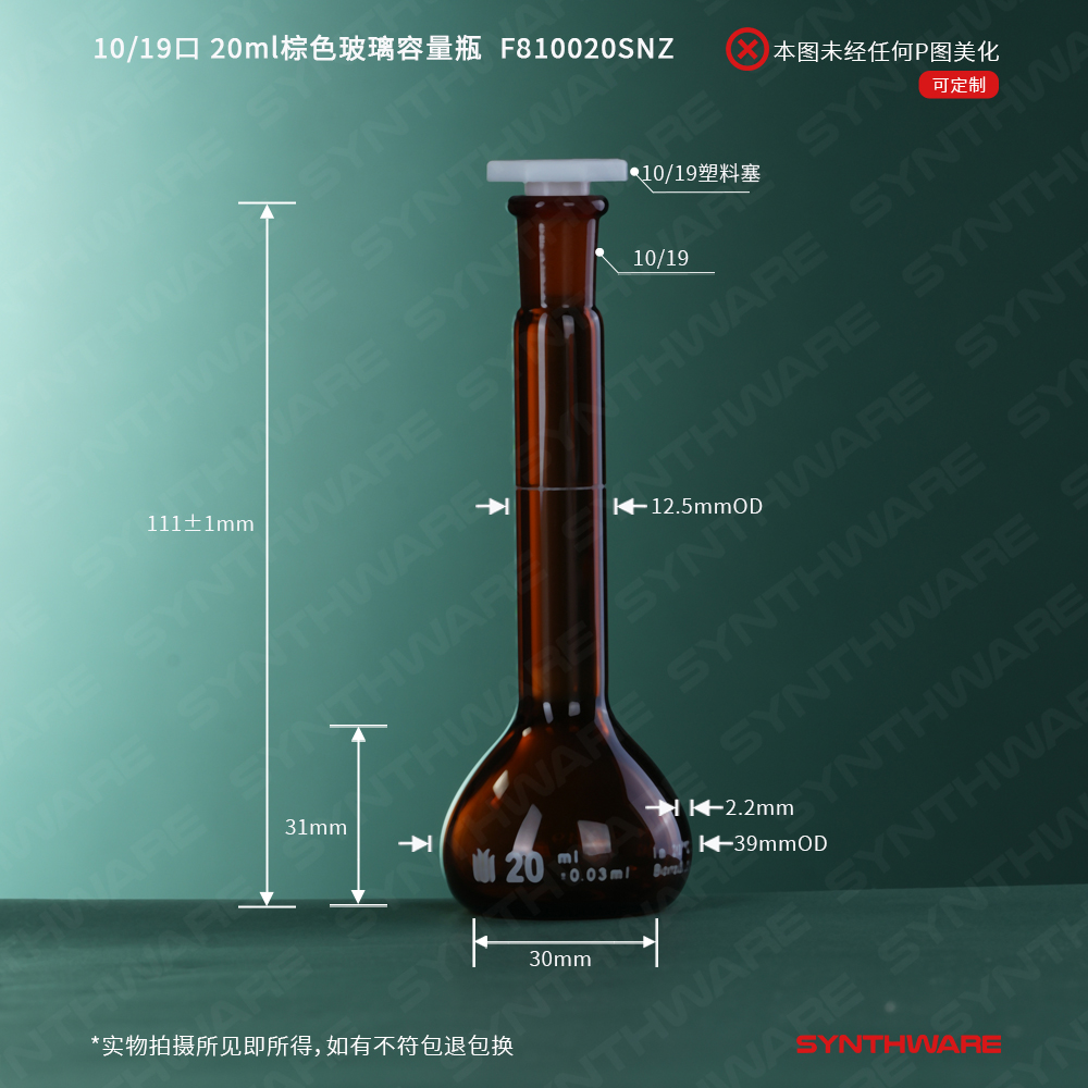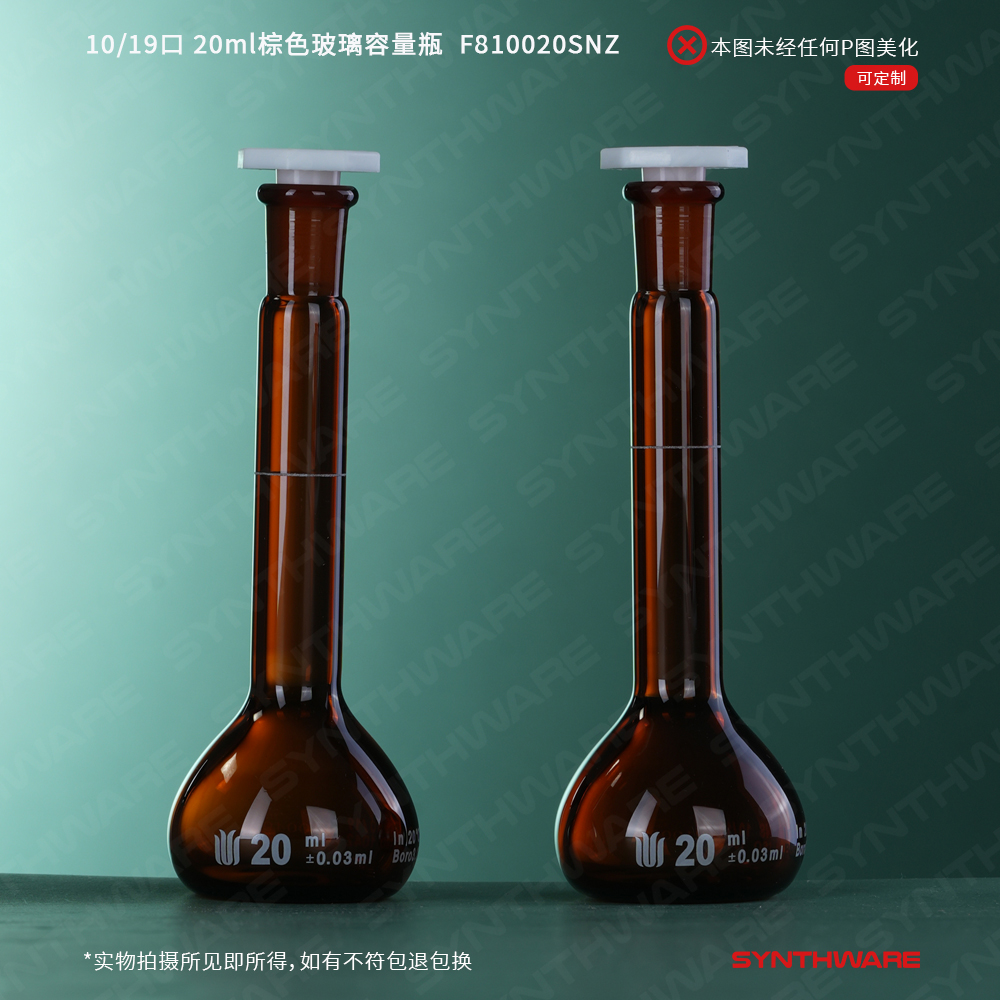 10/19口 20ml棕色玻璃容量瓶,标配塑料塞,带个体检测证书,2支/盒 F810020SNZ
