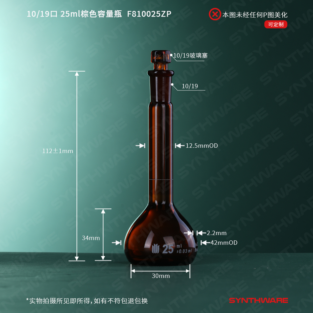 10/19口 25ml棕色容量瓶,标配玻璃塞,不带个体检测证书,2支/盒 F810025ZP