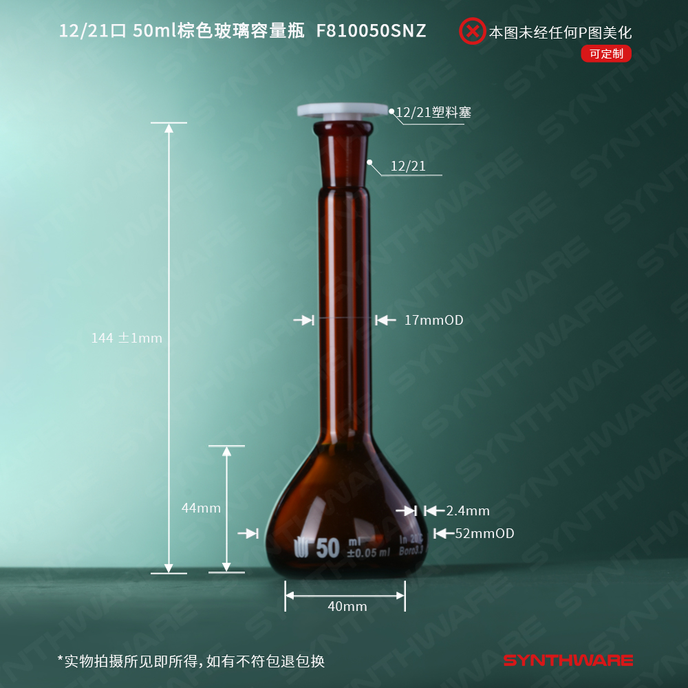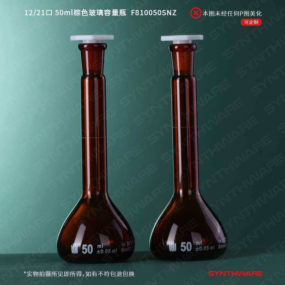 12/21口 50ml棕色玻璃容量瓶,标配塑料塞,带个体检测证书,2支/盒 F810050SNZ