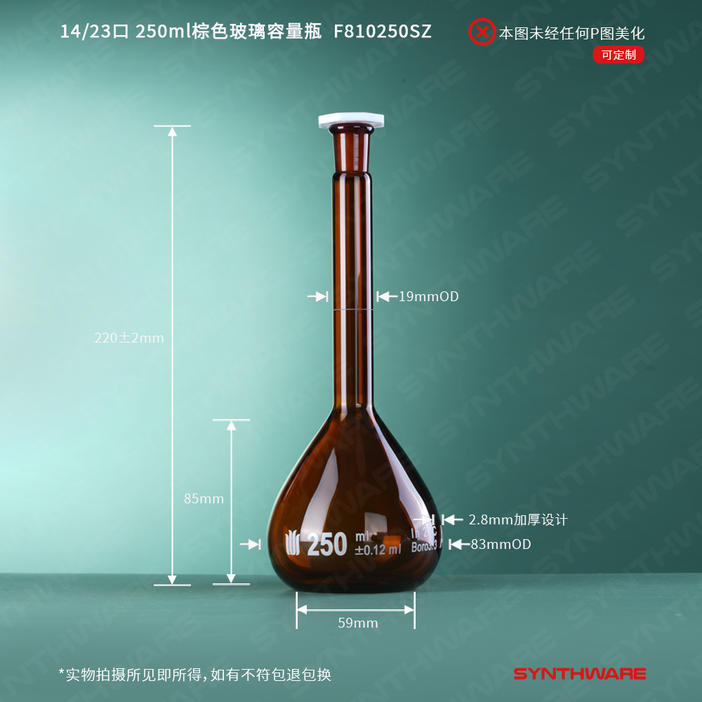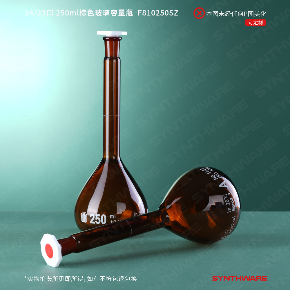 14/23口 250ml棕色玻璃容量瓶,标配塑料塞,不带个体检测证书,2支/盒 F810250SZ