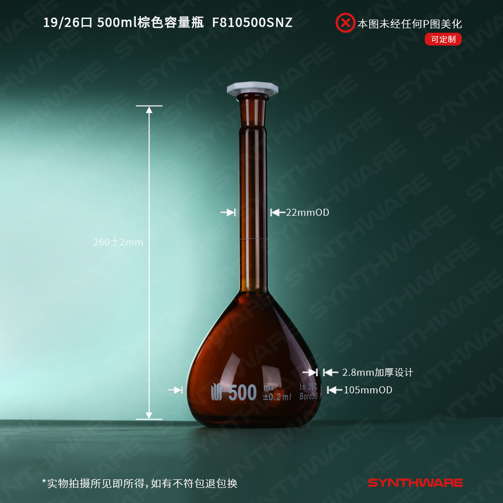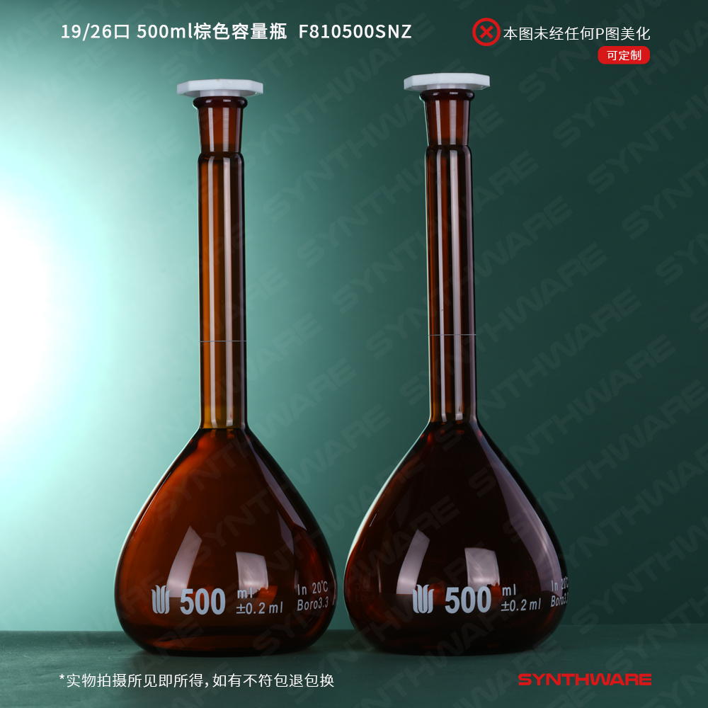 19/26口 500ml棕色玻璃容量瓶,标配塑料塞,带个体检测证书,2支/盒 F810500SNZ