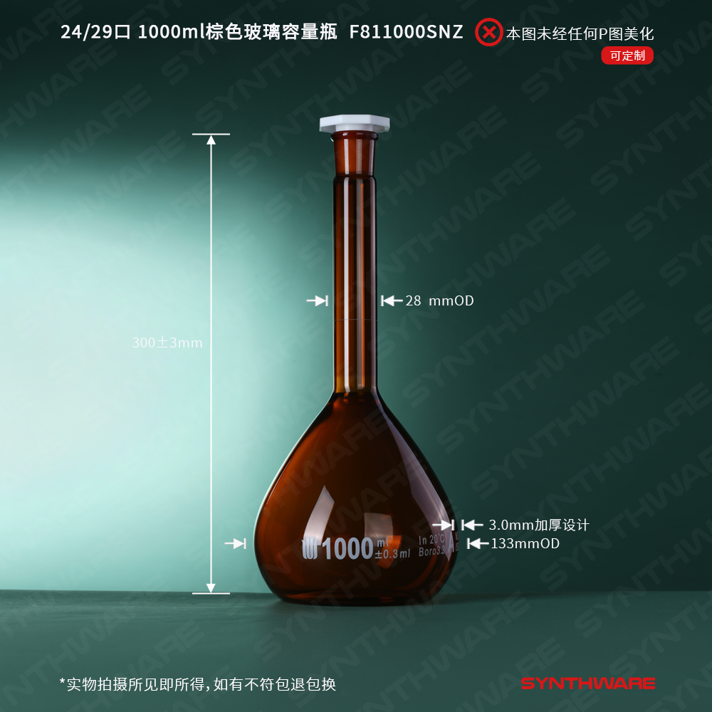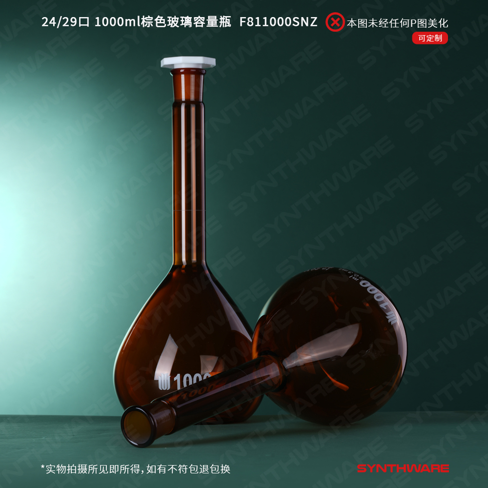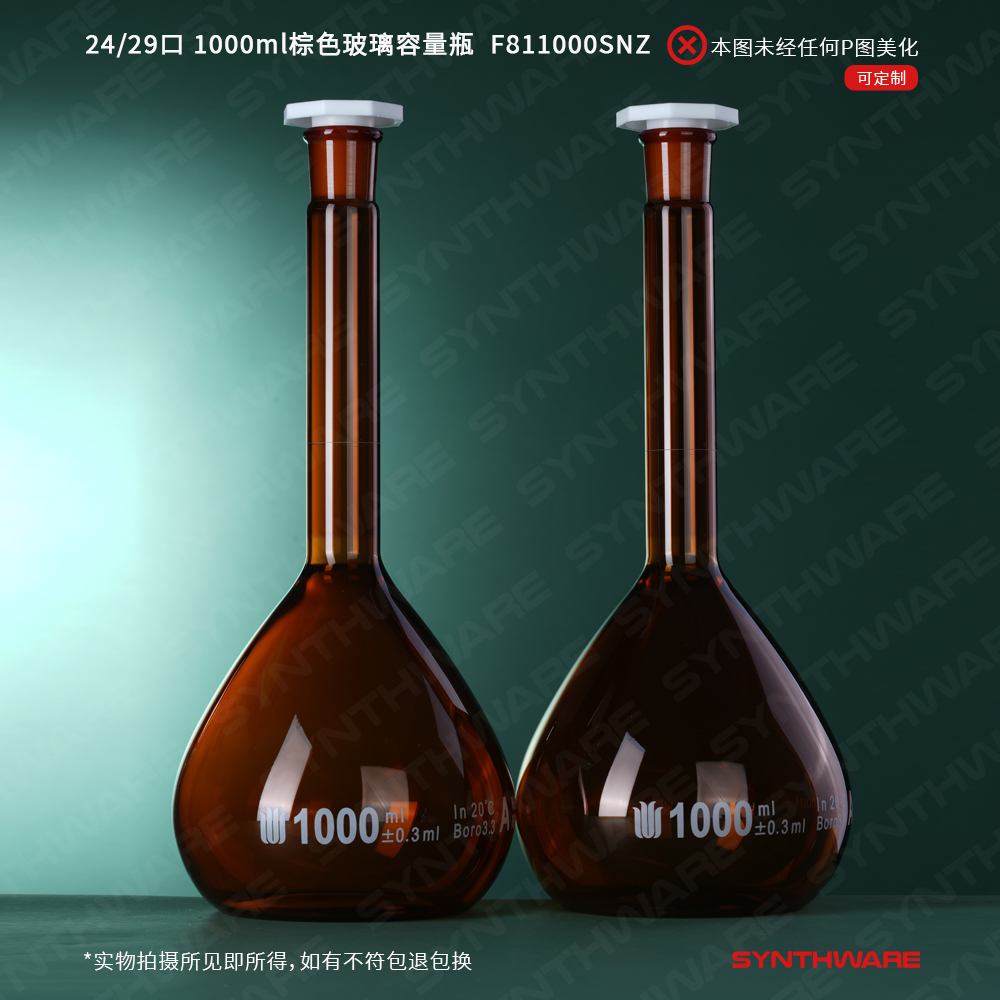 24/29口 1000ml棕色玻璃容量瓶,标配塑料塞,带个体检测证书,2支/盒 F811000SNZ