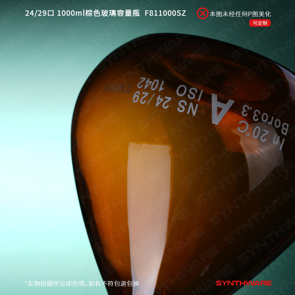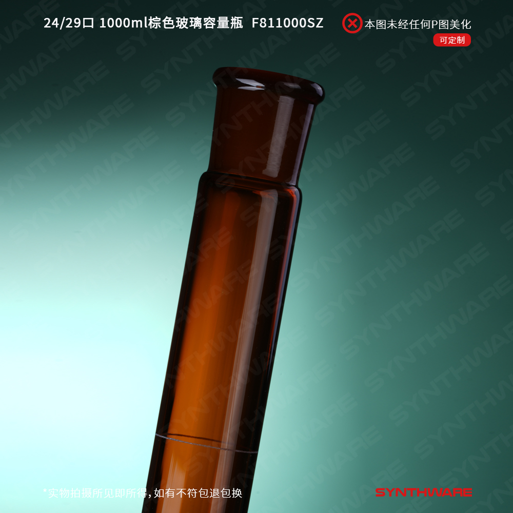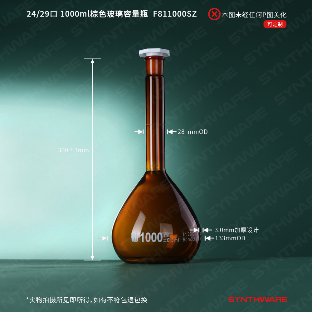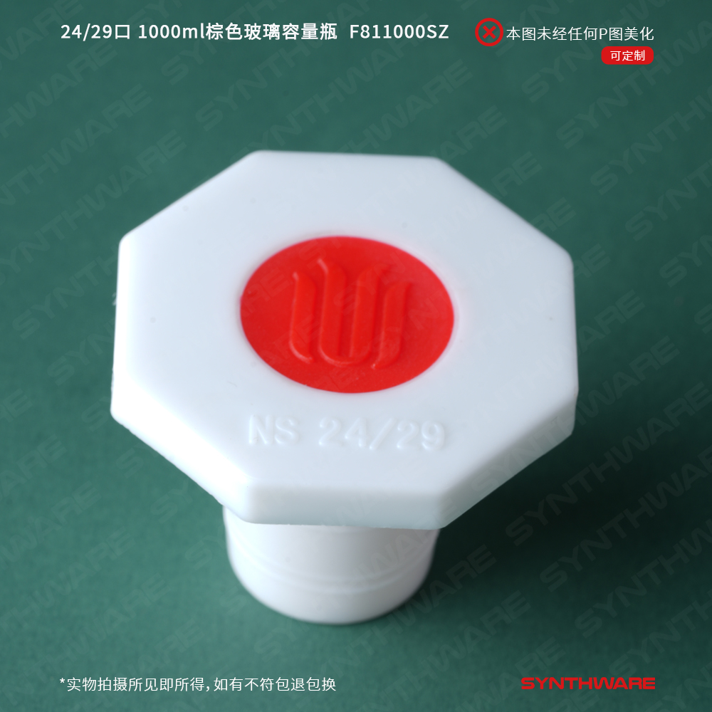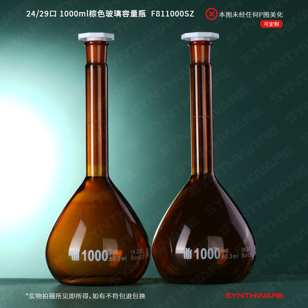 24/29口 1000ml棕色玻璃容量瓶,标配塑料塞,不带个体检测证书,2支/盒 F811000SZ