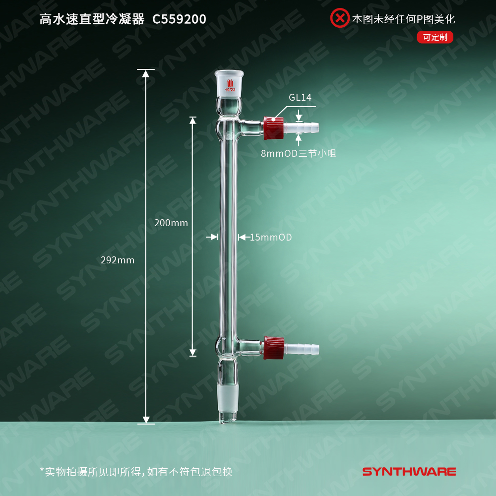 # 冷凝器上下两端为标准锥度磨口,上端内磨口由金刚砂研磨,锥度1:10经正弦规测试。下端外磨口由无心磨精密研磨,保证连接密封性。