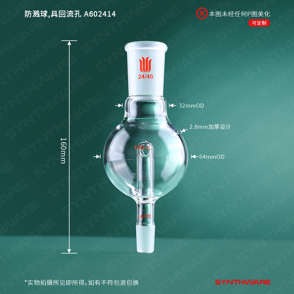 #同心度低于0.5mm 旋转不偏摆 出厂逐一检测,如有质量问题包退包换 #高精度内磨口 由400目金刚砂研磨,锥度1:10经正弦规测试 #外磨口精密加厚工艺 由高精度无心磨制得,加厚设计,不易裂开 #厚壁设计且均匀 耐负压,搭配旋转蒸发仪使用 #具回流孔设计 内管底部有两个4mm的回流孔,可使溶液回流到旋转蒸发瓶内