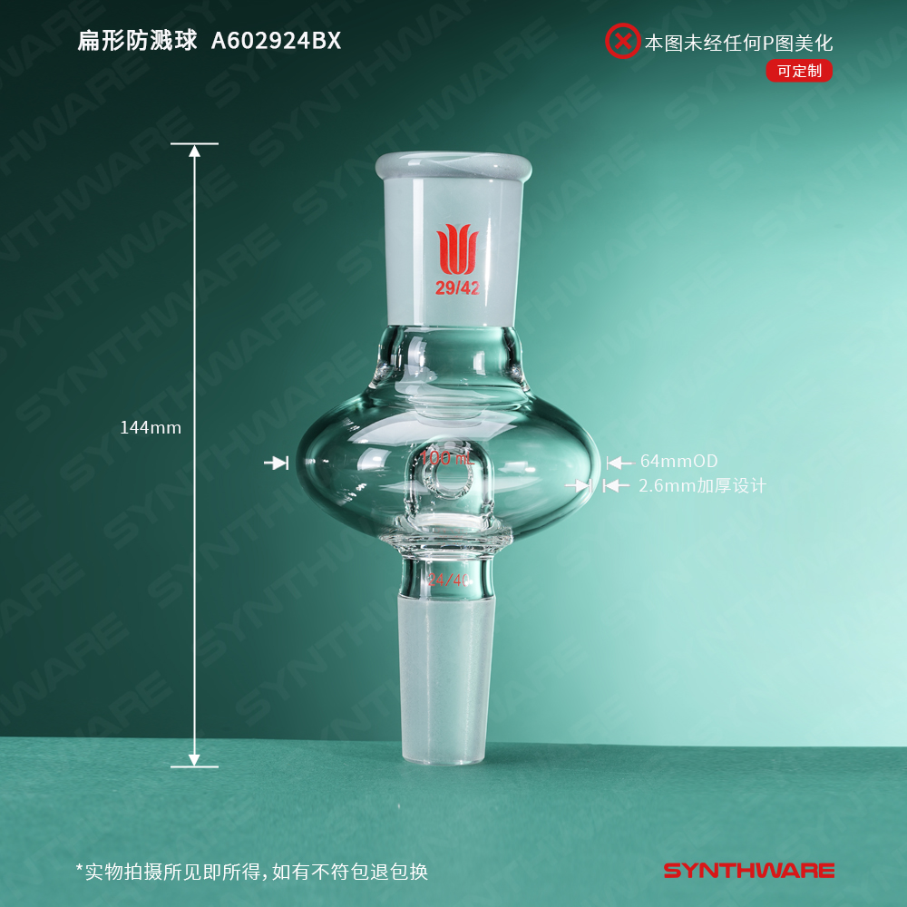旋蒸类 > 防溅球 > 具回流孔-扁形防溅球 > SYNTHWARE > 扁形防溅球,具回流孔,上磨口:29/42,下磨口:24/40,100ml A602924BX
