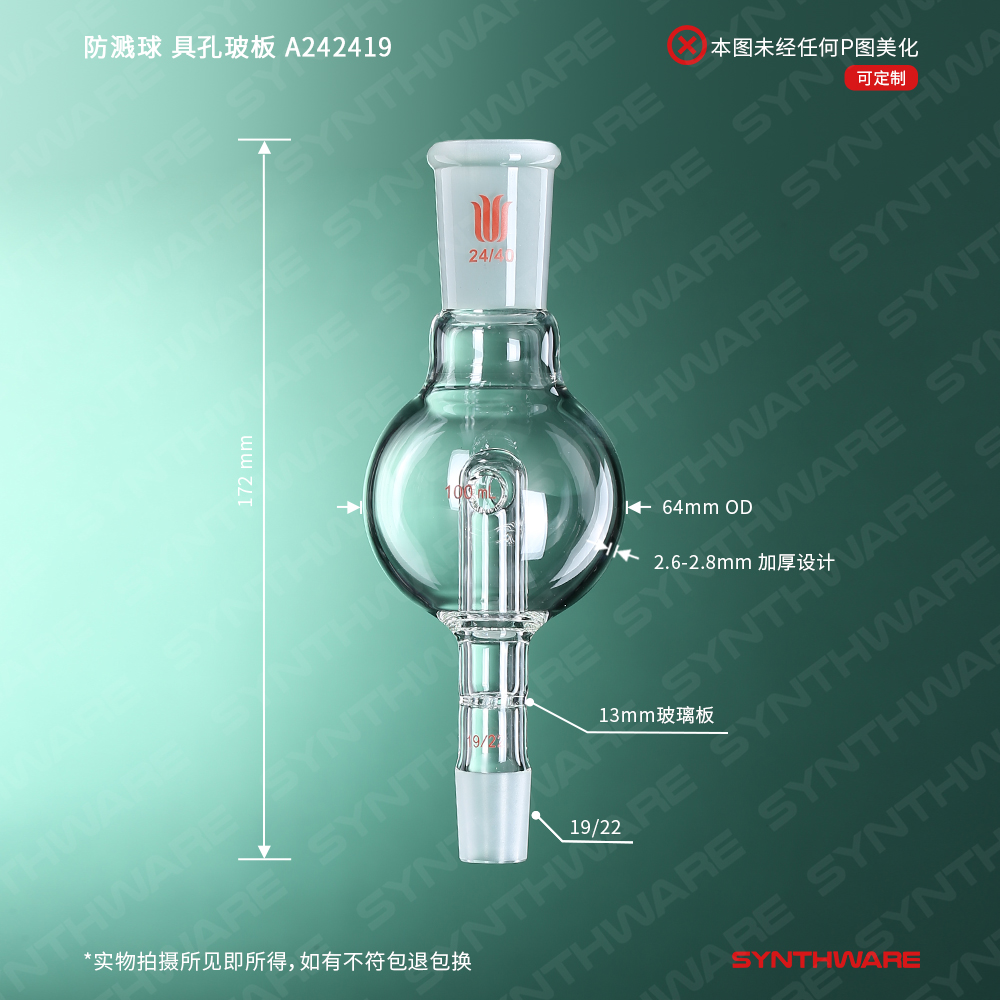 旋蒸类 > 防溅球 > 具多孔玻璃板防溅球 > SYNTHWARE > 防溅球,具孔玻板,上磨口:24/40,下磨口:19/22,100ml A242419