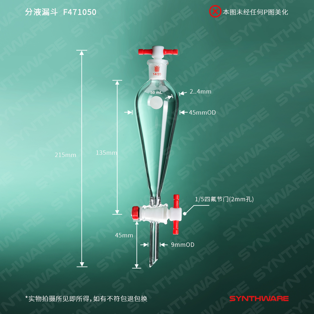 分液漏斗,上磨口:14/20四氟口塞,2mm四氟节门塞,50ml F471050