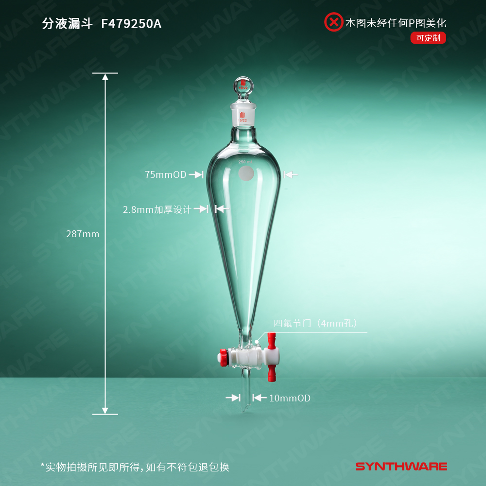 分液漏斗,上磨口:19/22玻璃口塞,4mm四氟节门塞,250ml F479250A