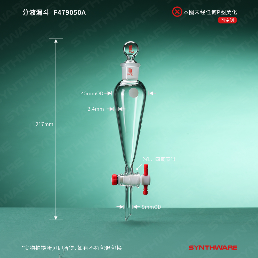 分液漏斗,上磨口:19/22玻璃口塞,2mm四氟节门塞,50ml F479050A