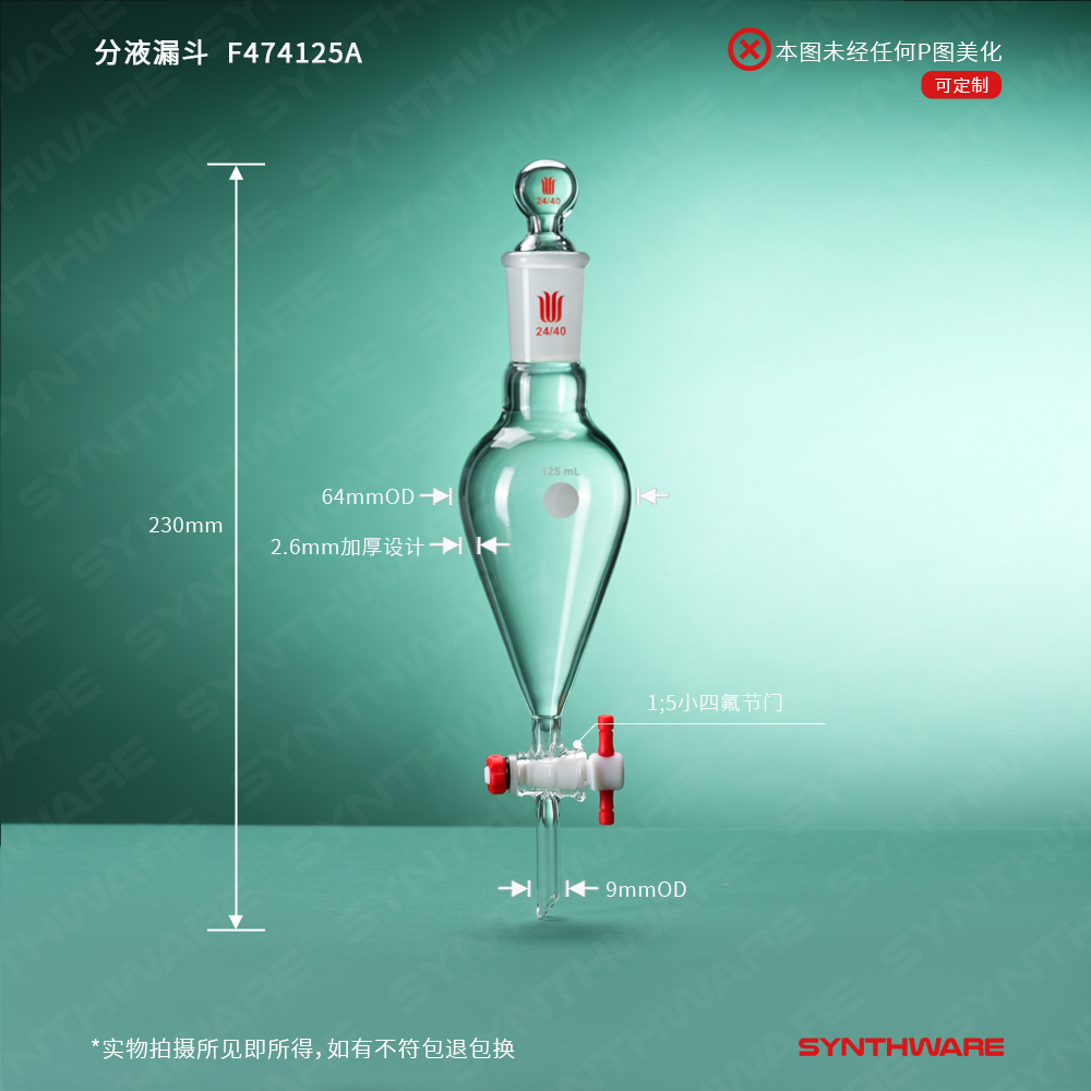 分液漏斗,上磨口:24/40玻璃口塞,2mm四氟节门塞,125ml F474125A