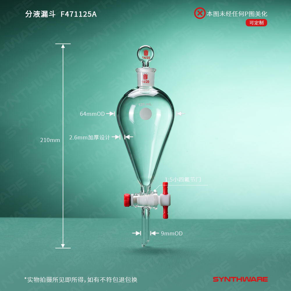 分液漏斗,上磨口:14/20玻璃口塞,2mm四氟节门塞,125ml F471125A