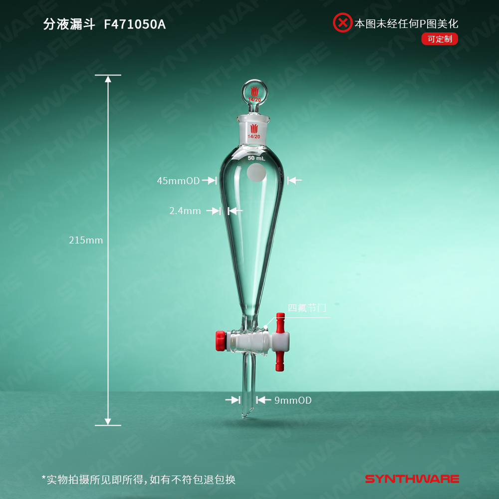 分液漏斗,上磨口:14/20玻璃口塞,2mm四氟节门塞,50ml F471050A