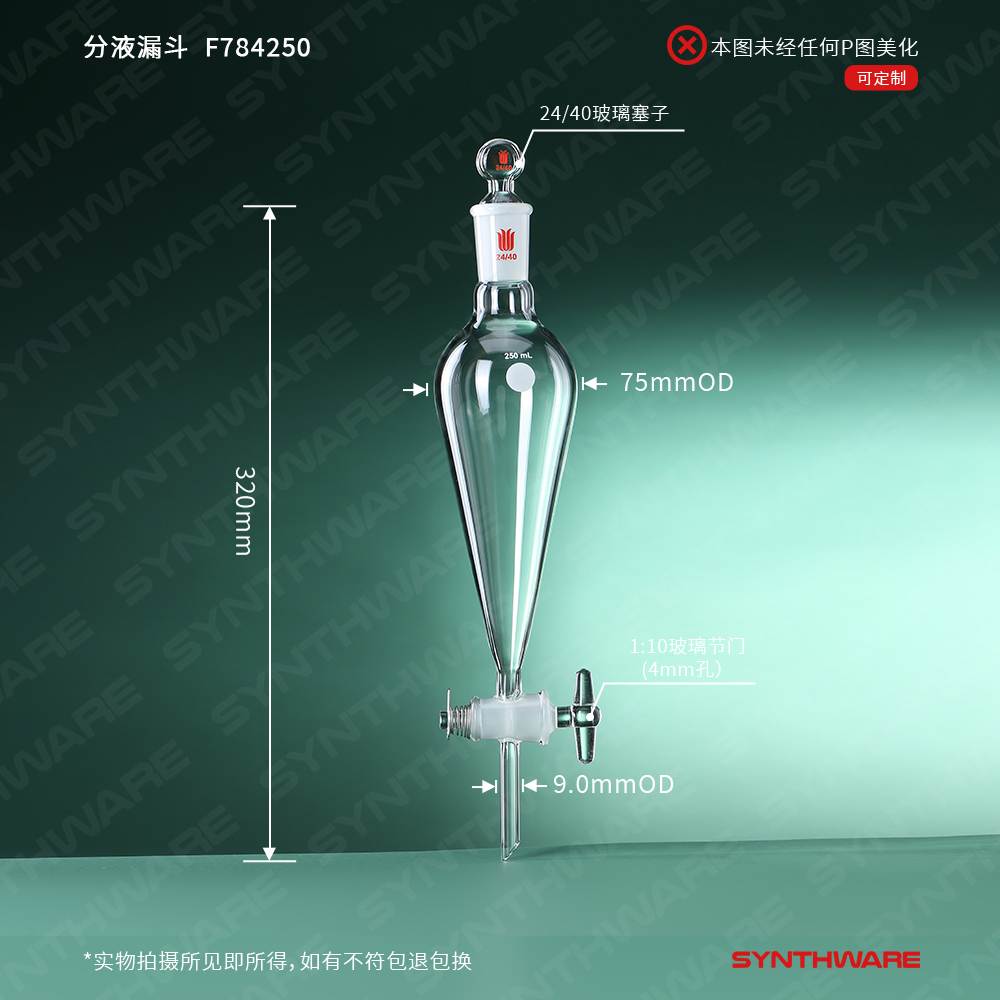分液漏斗,玻璃节门,250ml,24/40玻璃塞子 F784250