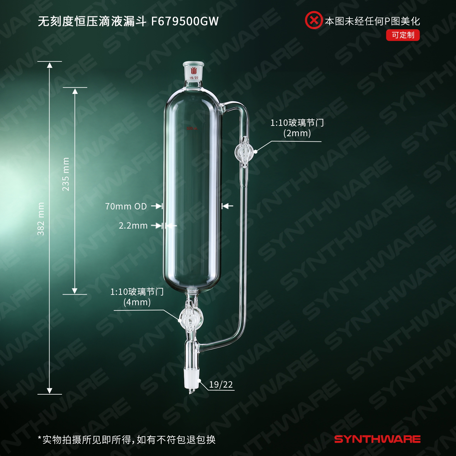 无刻度恒压滴液漏斗,双玻璃节门,500ml,19/22 F679500GW