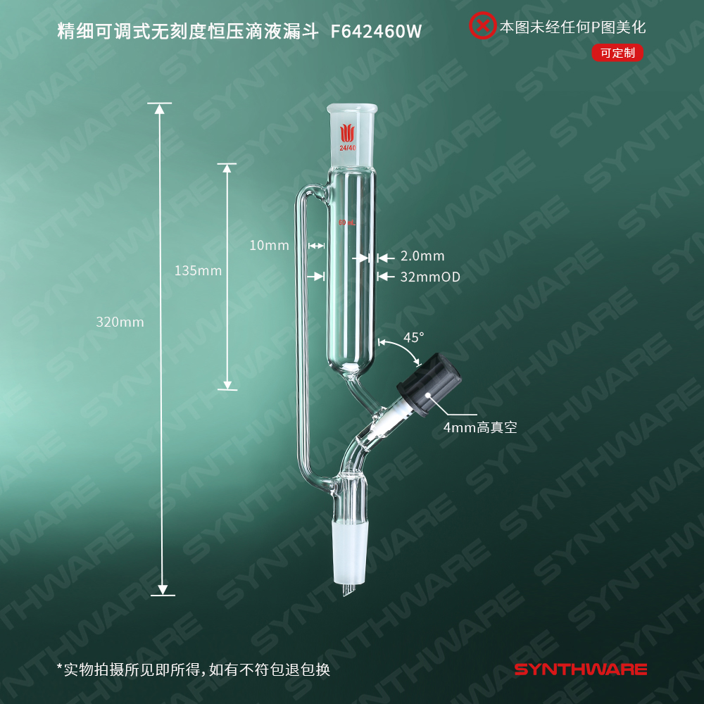 精细可调式无刻度恒压滴液漏斗,4mm高真空阀,60ml,24/40 F642460W