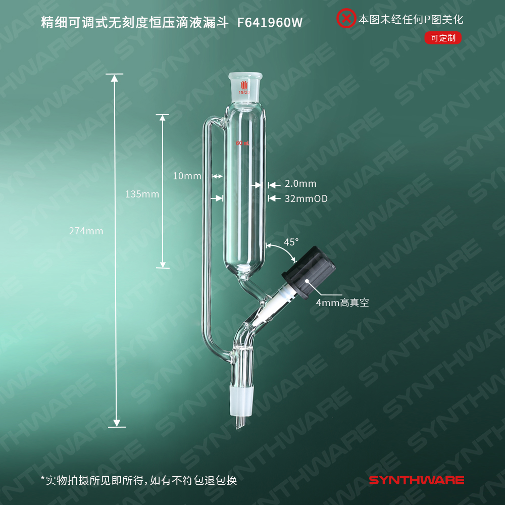 精细可调式无刻度恒压滴液漏斗,4mm高真空阀,60ml,24/40 F642460W