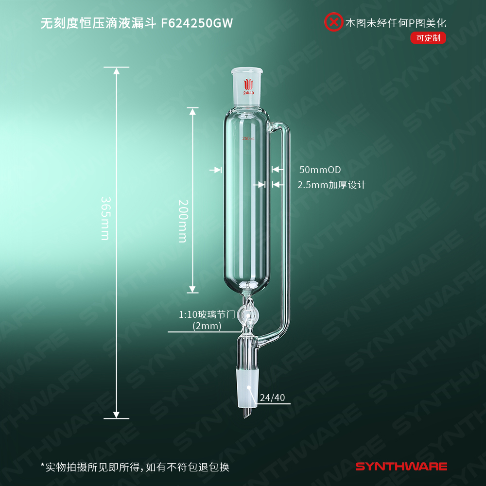 无刻度恒压滴液漏斗,玻璃节门,250ml,24/40 F624250GW