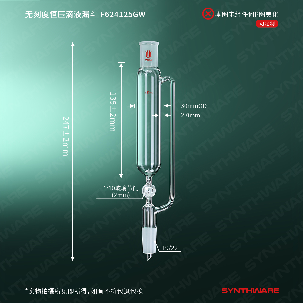 无刻度恒压滴液漏斗,玻璃节门,125ml,24/40 F624125GW