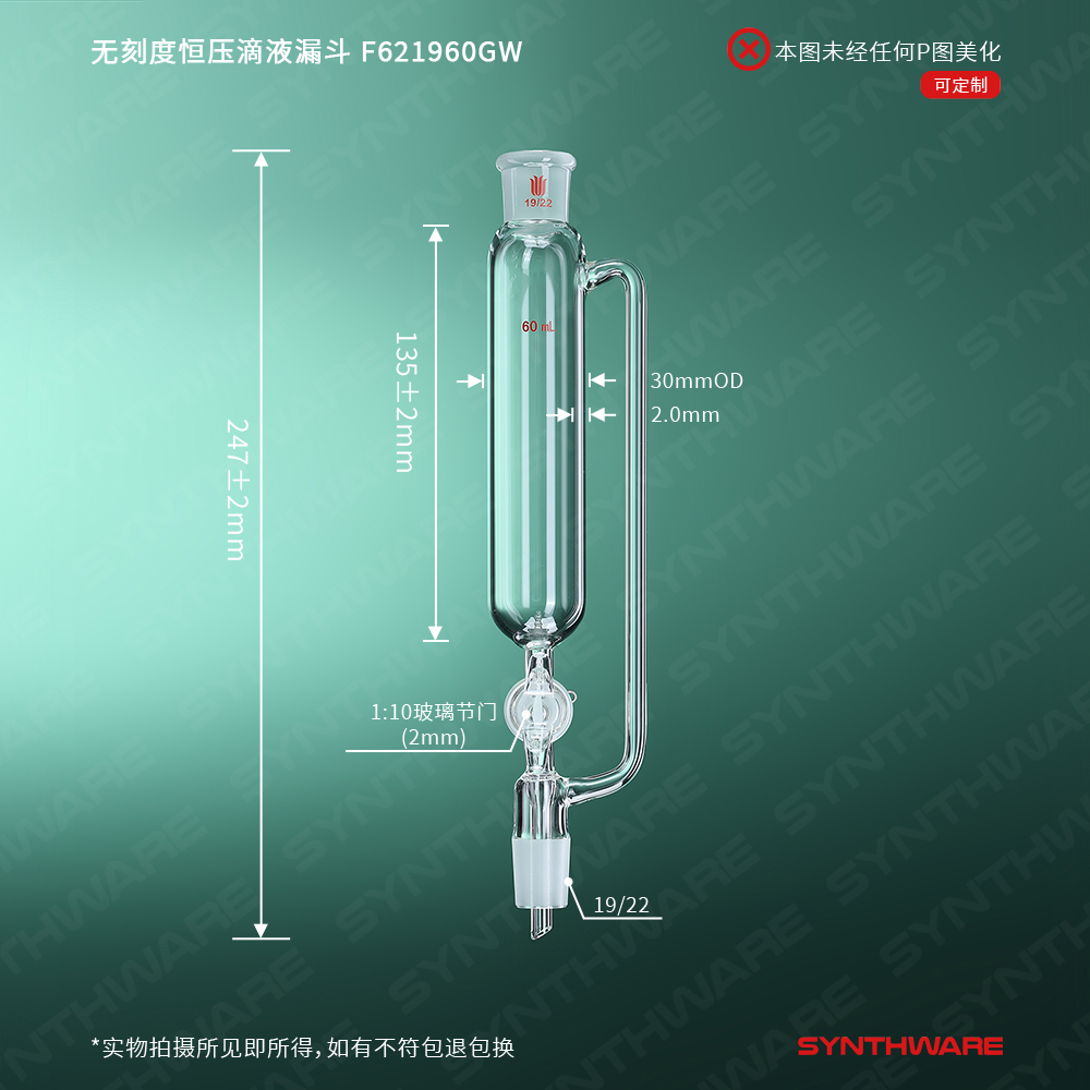 无刻度恒压滴液漏斗,玻璃节门,60ml,19/22 F621960GW