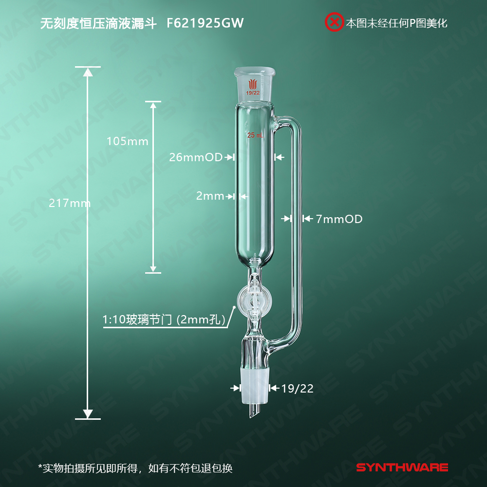 无刻度恒压滴液漏斗,玻璃节门,25ml,19/22 F621925GW