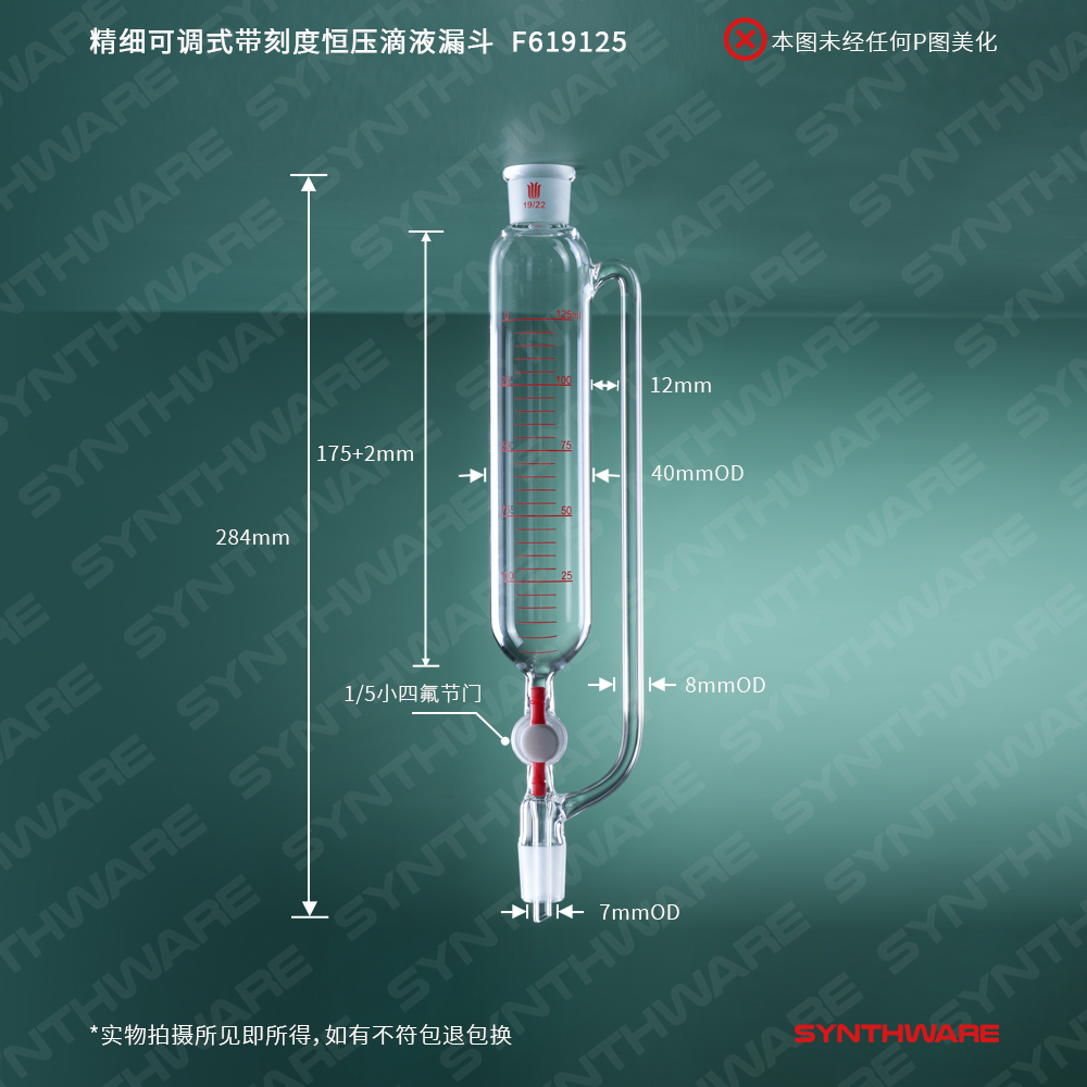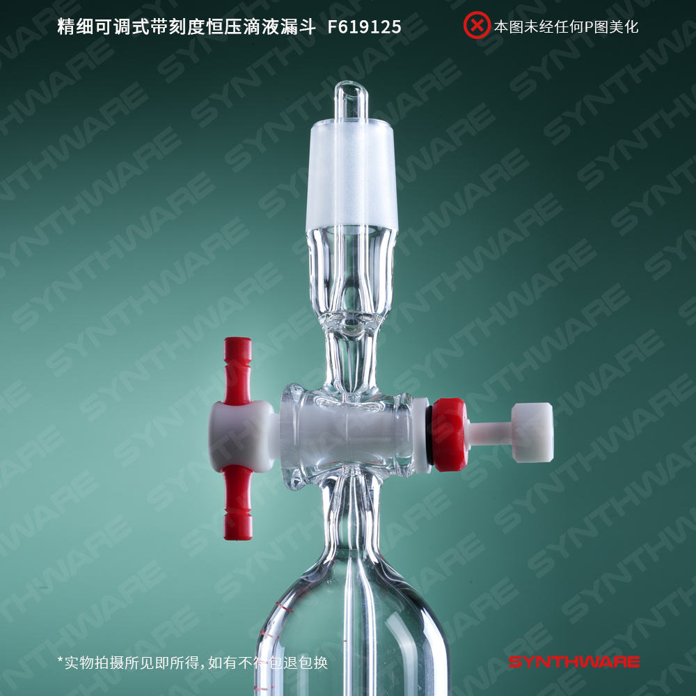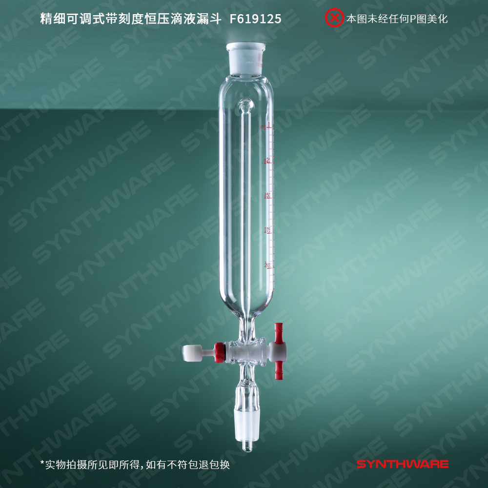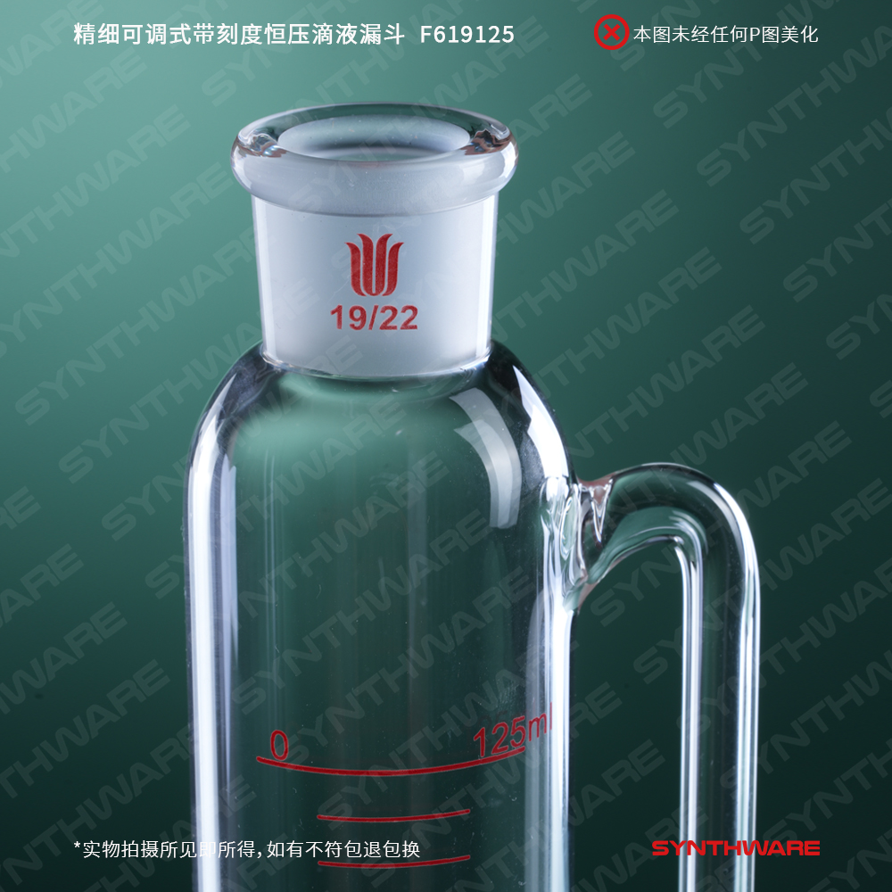 漏斗类 > 恒压滴液漏斗 > 带刻度-精细可调式四氟节门滴液漏斗 > SYNTHWARE > 精细可调式带刻度恒压滴液漏斗,125ml,19/22 F619125