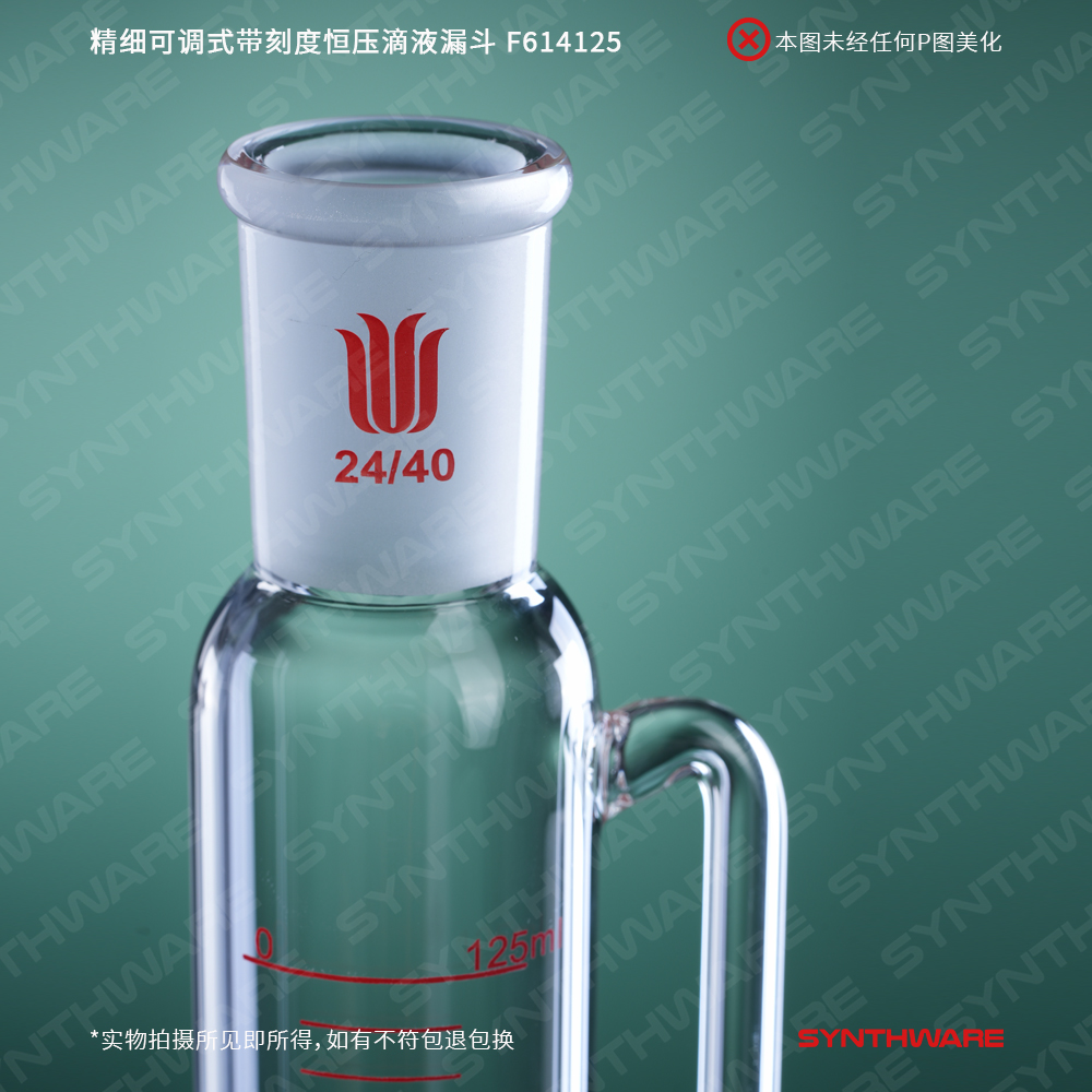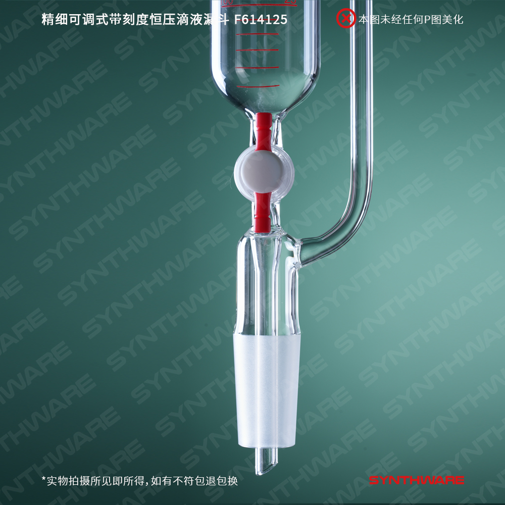 带四氟精细可调节门的恒压滴液漏斗。可通过旋转节门进行粗调,并通过尾部旋钮进行微调。这种精细可调节门可以更好的控制流速,流量,防止加入液体反应过快。
