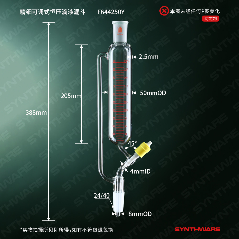 精细可调式恒压滴液漏斗,新型4mm高真空阀,250ml,24/40 F644250Y