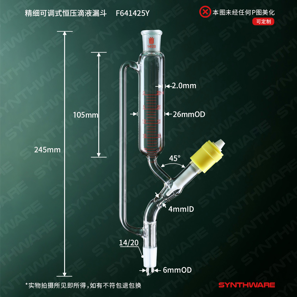 漏斗类 > 恒压滴液漏斗 > 带刻度-新型高真空节门滴液漏斗 > SYNTHWARE > 精细可调式恒压滴液漏斗,新型4mm高真空阀,25ml,14/20 F641425Y